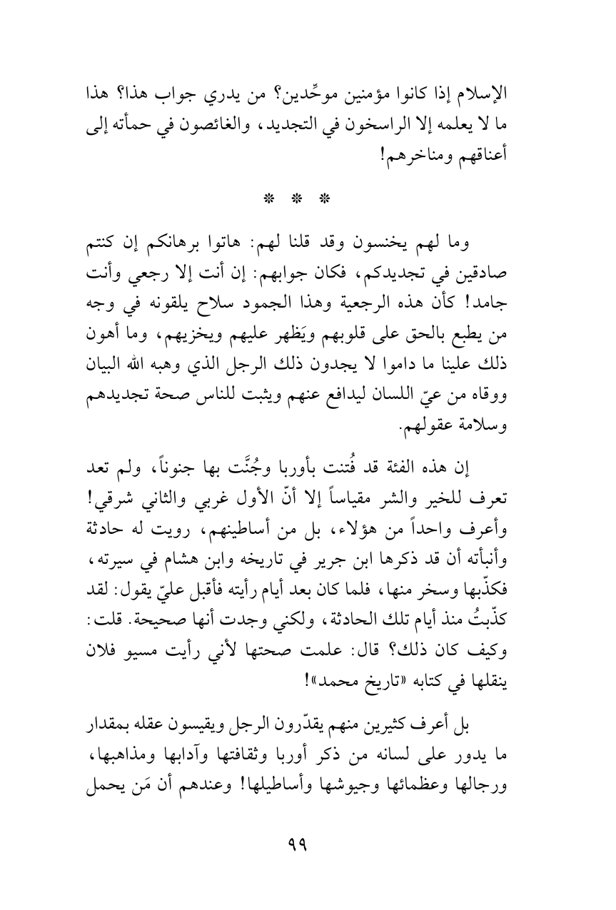 إن هذه الفئة قد فُتنت بأوربا وجُنَّت بها جنوناً، ولم تعد تعرف للخير والشر مقياساً إلا أنّ الأول غربي والثاني شرقي! وأعرف واحداً من هؤلاء، بل من أساطينهم، رويت له حادثة وأنبأته أن قد ذكرها ابن جرير في تاريخه وابن هشام في سيرته، فكذّبها وسخر منها، فلما كان بعد أيام رأيته فأقبل عليّ يقول: لقد كذّبتُ منذ أيام تلك الحادثة، ولكني وجدت أنها صحيحة. قلت: وكيف كان ذلك؟ قال: علمت صحتها لأني رأيت مسيو فلان ينقلها في كتابه «تاريخ محمد»!