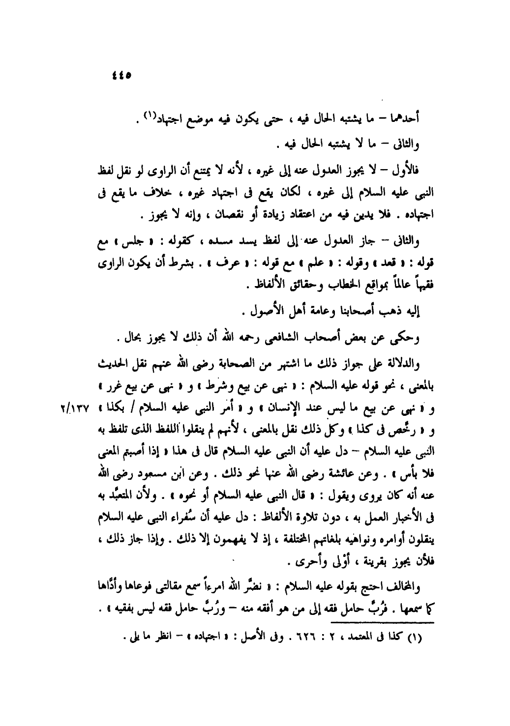 فالأول- لا يجوز العدول عنه إلى غيره، لأنه لا يمتنع أن الراوي لو نقل لفظ النبي عليه السلام إلى غيره، لكان يقع في اجتهاد غيره، خلاف ما يقع في اجتهاده. فلا يدين فيه من اعتقاد زيادة أو نقصان، ولأنه لا يجوز.
