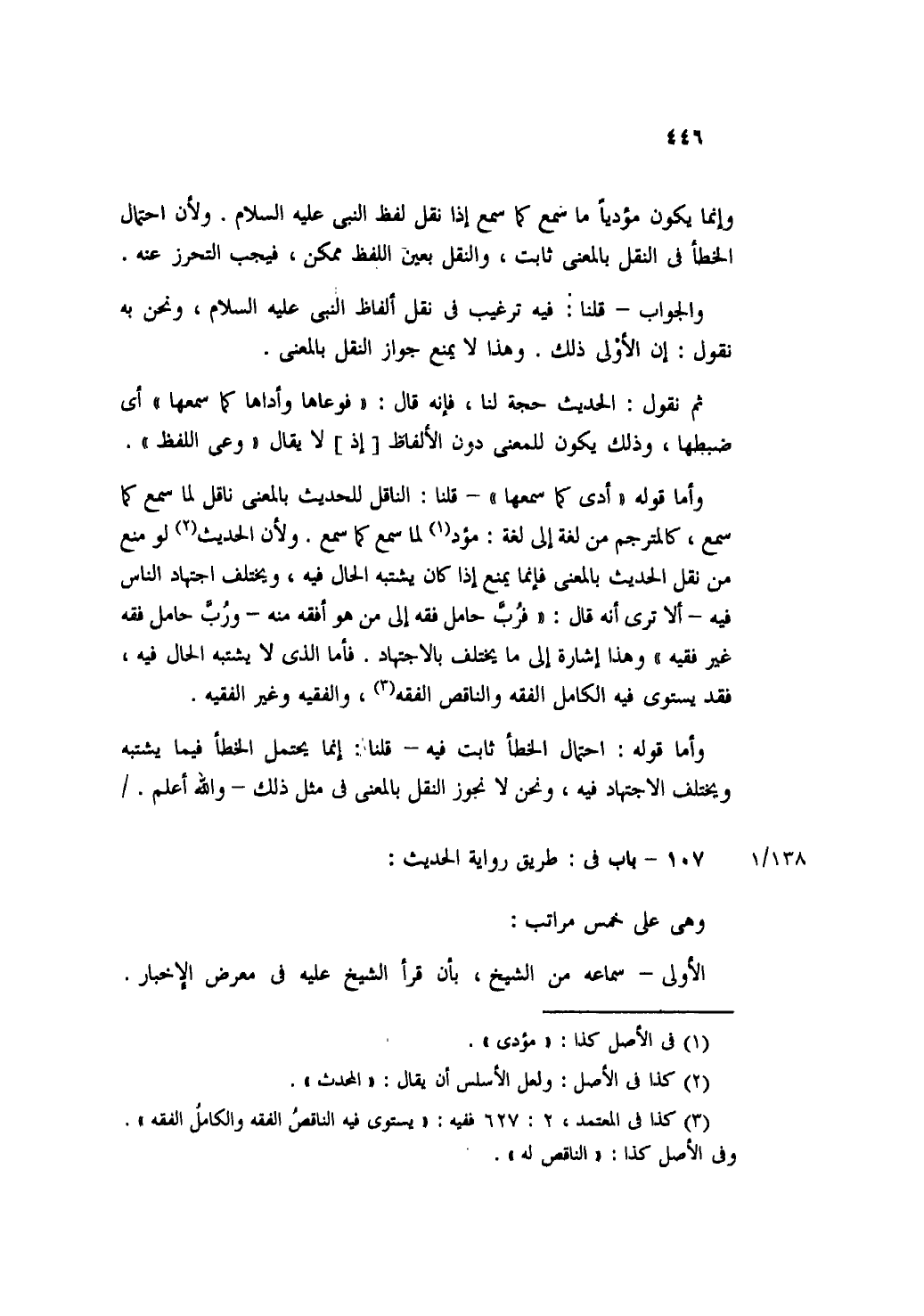 وأما قوله "أدى كما سمعها"- قلنا: الناقل للحديث بالمعنى ناقل لما سمع كما سمع، كالمترجم من لغة إلى لغة: مؤد لما سمع كما سمع. ولأن الحديث لو منع من نقل الحديث بالمعنى فإنما يمنع إذا كان يشتبه الحال فيه، ويختلف اجتهاد الناس فيه- ألا ترى أنه قال: "فرب حامل فقه إلى من هو أفقه منه- ورب حامل فقه غير فقيه" وهذا إشارة إلى ما يختلف بالاجتهاد. فأما الذي لا يشتبه الحال فيه، فقد يستوي فيه الكامل الفقه والناقص الفقه، والفقيه وغير الفقيه.