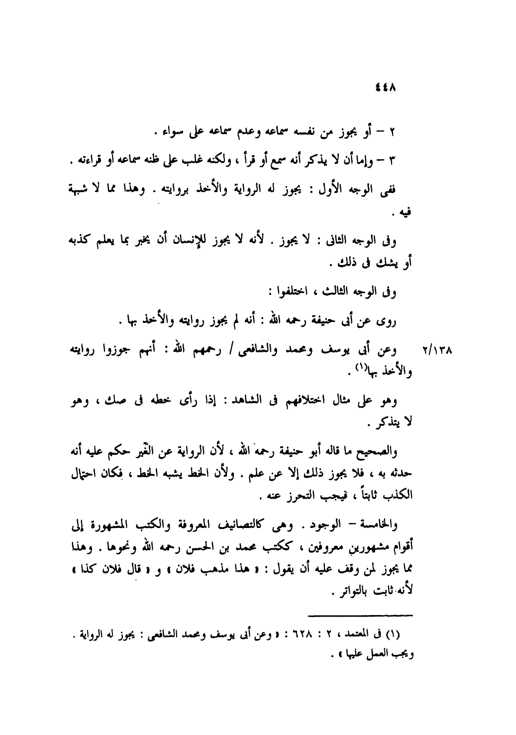 والخامسة- الوجود. وهى كالتصانيف المعروفة والكتب المشهورة إلى أقوام مشهورين معروفين، ككتب محمد بن الحسن رحمه الله ونحوها. وهذا مما يجوز لمن وقف عليه أن يقول: "هذا مذهب فلان"، و"قال فلان كذا" لأنه ثابت بالتواتر.