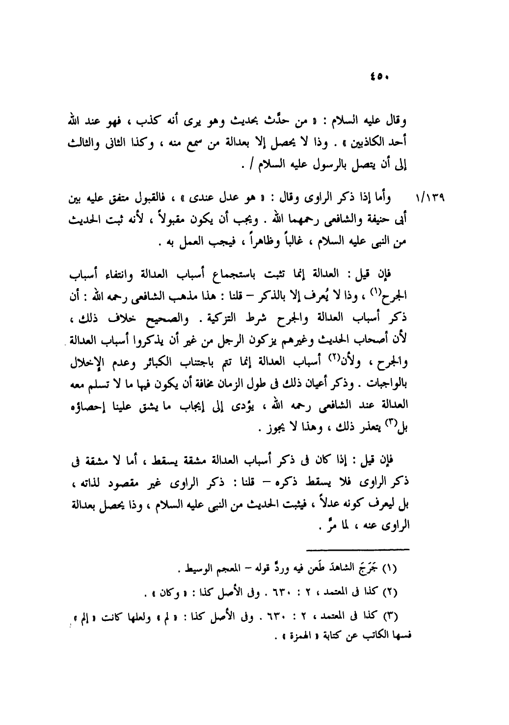 وقال عليه السلام: "من حدث بحديث وهو يرى أنه كذب، فهو عند الله أحد الكاذبين". وذا لا يحصل إلا بعدالة من سمع منه، وكذا الثاني والثالث إلى أن يتصل بالرسول عليه السلام.