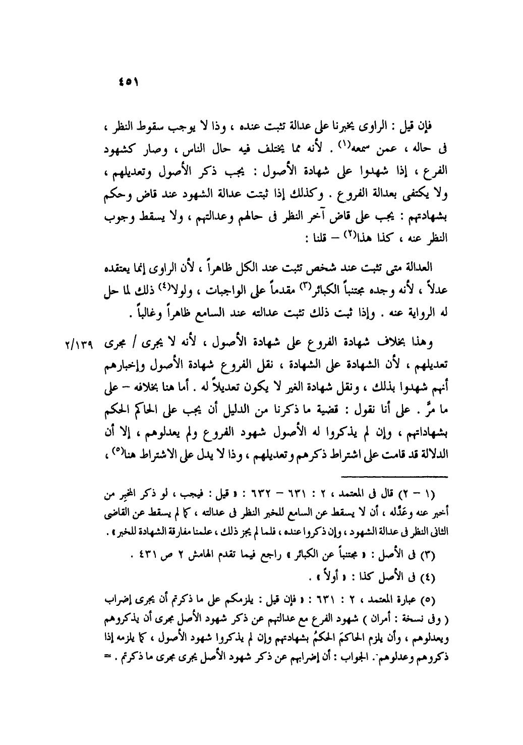فإن قيل: الراوي يخبرنا على عدالة تثبت عنده، وذا لا يوجب سقوط النظر، في حاله، عمن سمعه. لأنه مما يختلف فيه حال الناس، وصار كشهود الفرع، إذا شهدوا على شهادة الأصول: يجب ذكر الأصول وتعديلهم، ولا يكتفي بعدالة الفروع. وكذلك إذا ثبتت عدالة الشهود عند قاض وحكم بشهادتهم: يجب على قاض آخر النظر في حالهم وعدالتهم، ولا يسقط وجوب النظر عنه، كذا هذا- قلنا: