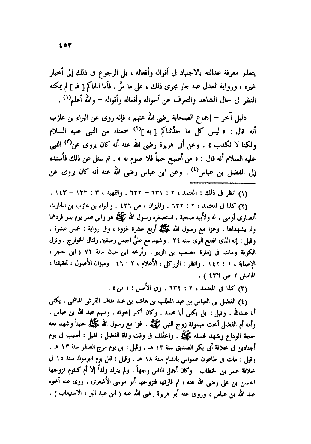 دليل آخر- إجماع الصحابة رضي الله عنهم، فإنه روى عن البراء بن عازب أنه قال: "ليس كل ما حدثناكم [به] سمعناه من النبي عليه السلام ولكنا لا نكذب". وعن أبي هريرة رضي الله عنه أنه كان يروى عن النبي عليه السلام أنه قال: "من أصبح جنباً فلا صوم له". ثم سئل عن ذلك فأسنده إلى الفضل بن عباس. وعن ابن عباس رضي الله عنه أنه كان يروى عن
