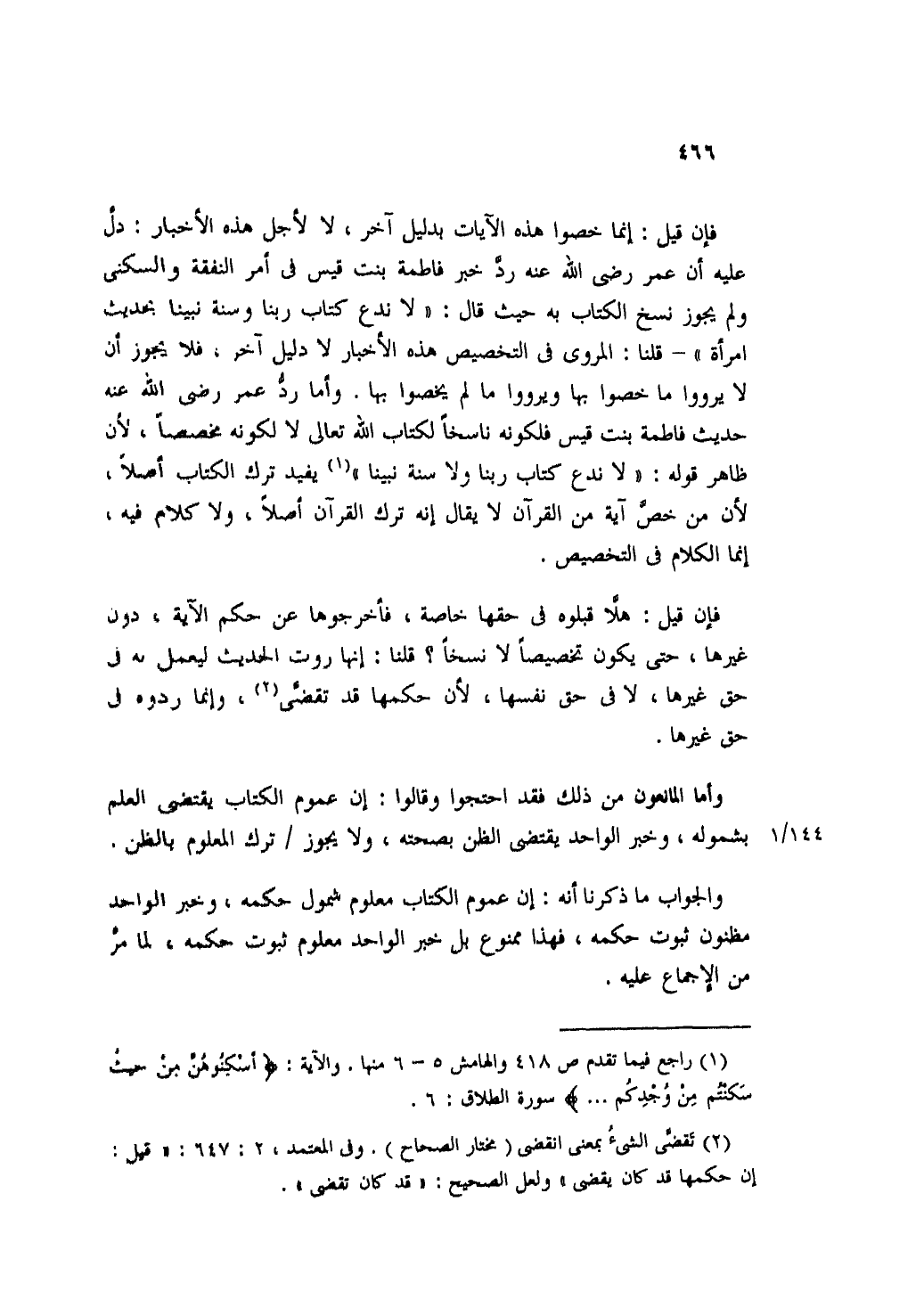 فإن قيل: إنما خصوا هذه الآيات بدليل آخر، لا لأجل هذه الأخبار: دل عليه أن عمر رضي الله عنه رد خبر فاطمة بنت قيس في أمر النفقة والسكنى ولم يجوز نسخ الكتاب به حيث قال: "لا ندع كتاب ربنا وسنة نبينا بحديث امرأة"- قلنا: المروى في التخصيص هذه الأخبار لا دليل آخر، فلا يجوز أ، لا يرووا ما خصرا بها ويرووا ما لم يخصوا بها. وأما رد عمر رضي الله عنه حديث فاطمة بنت قيس فلكونه ناسخاً لكتاب الله تعالى لا لكونه مخصصاً، لأن ظاهر قوله: "لا ندع كتاب ربنا ولا سنة نبينا" يفيد ترك الكتاب أصلاً، لأن من خص آية من القرآن لا يقال إنه ترك القرآن أصلاً، ولا كلام فيه، إنما الكلام في التخصيص.