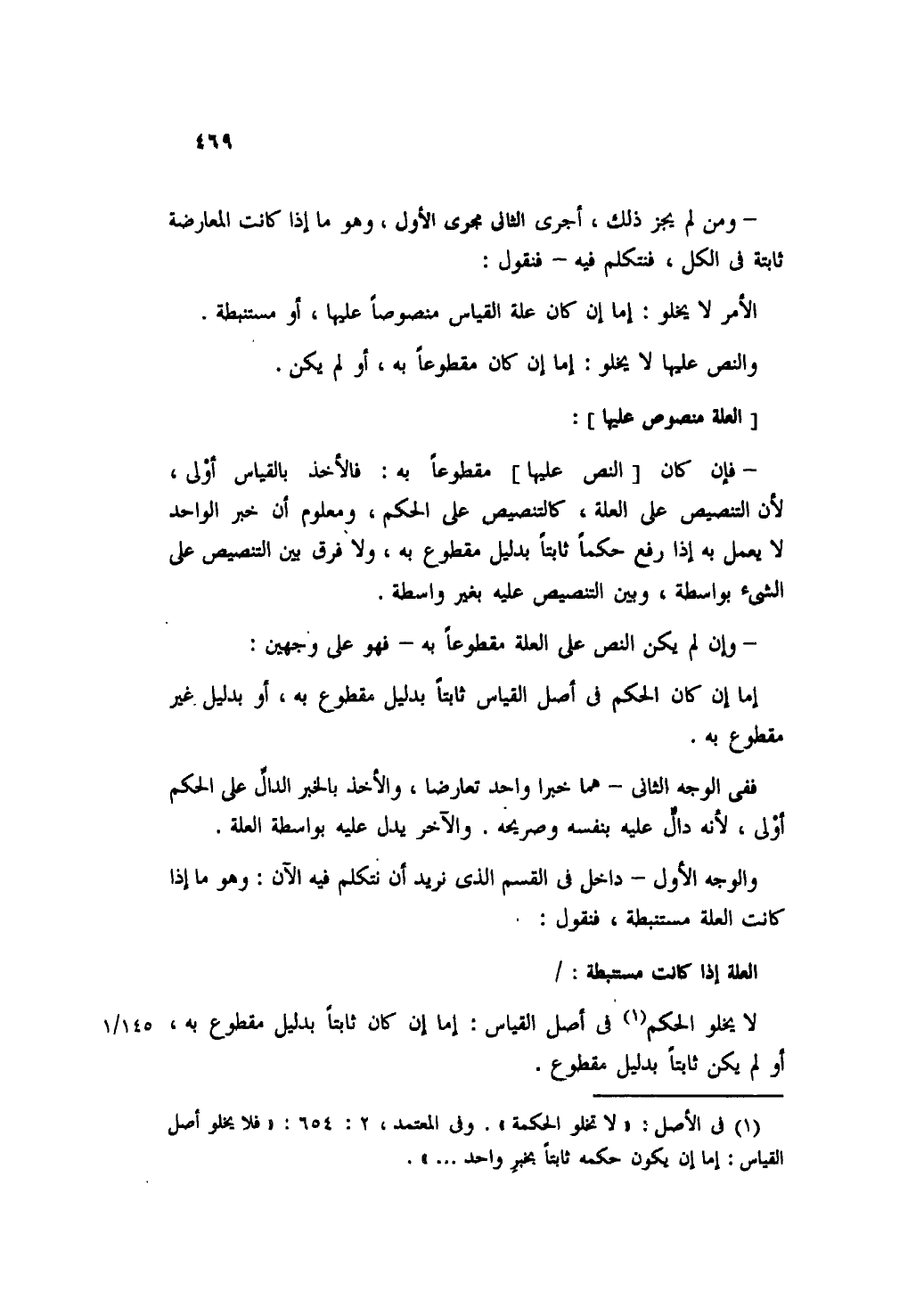 - فإن كان [النص عليها] مقطوعاً به: فالأخذ بالقياس أولى، لأن التنصيص على العلة، كالتنصيص على الحكم، ومعلوم أن خبر الواحد لا يعمل به إذا رفع حكماً ثابتاً بدليل مقطوع به، ولا فرق بين التنصيص على الشيء بواسطة، وبين التنصيص عليه بغير واسطة.