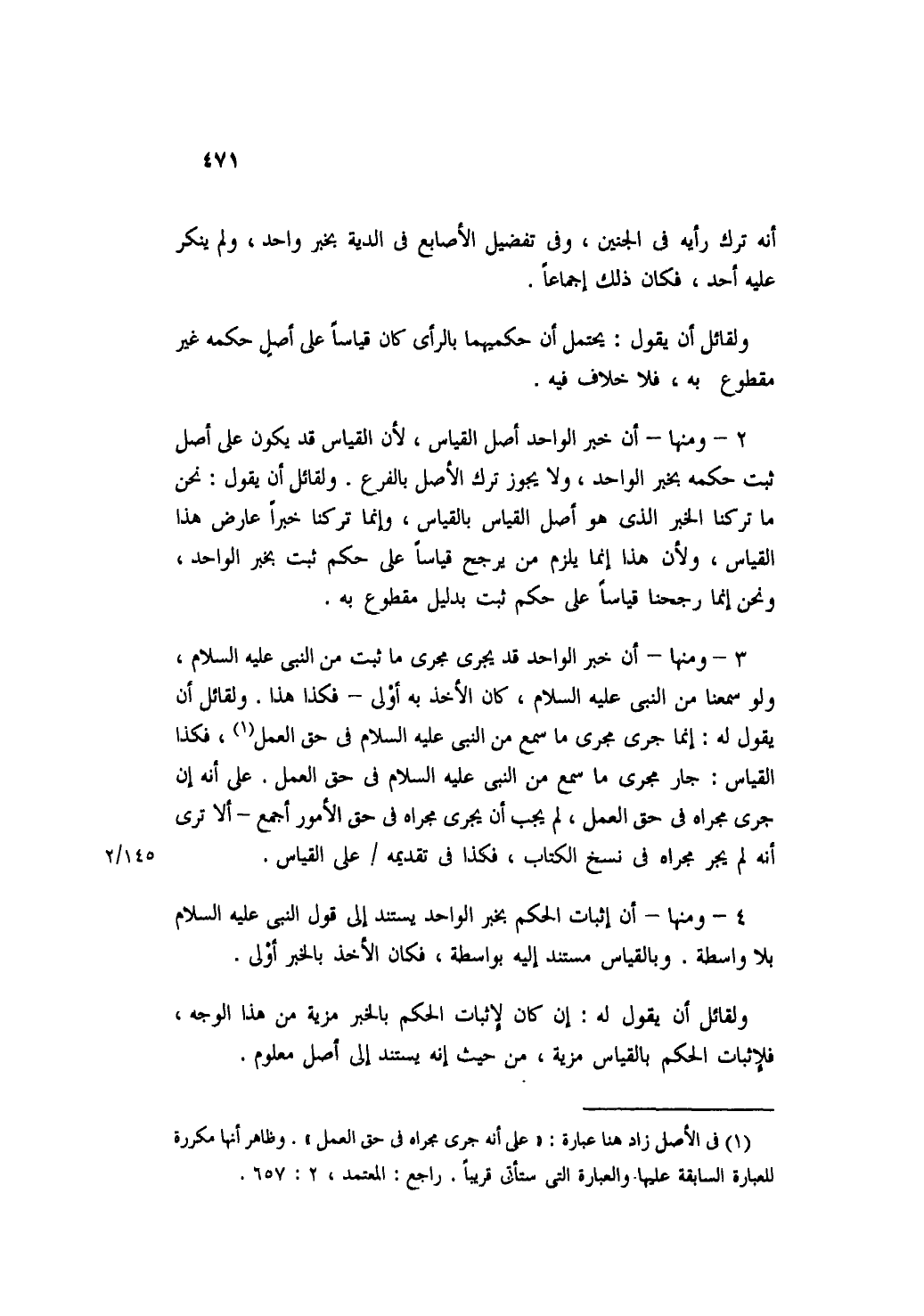 ٢ - ومنها- أن خبر الواحد أصل القياس، لأن القياس قد يكون على أصل ثبت حكمه بخبر الواحد، ولا يجوز ترك الأصل بالفرع. ولقائل أن يقول: نحن ما تركنا الخبر الذي هو أصل القياس بالقياس، وإنما تركنا خبراً عارض هذا القياس، ولأن هذا إنما يلزم من يرجح قياساً على حكم ثبت بخبر الواحد، ونحن إنما رجحنا قياساً على حكم ثبت بدليل مقطوع به.