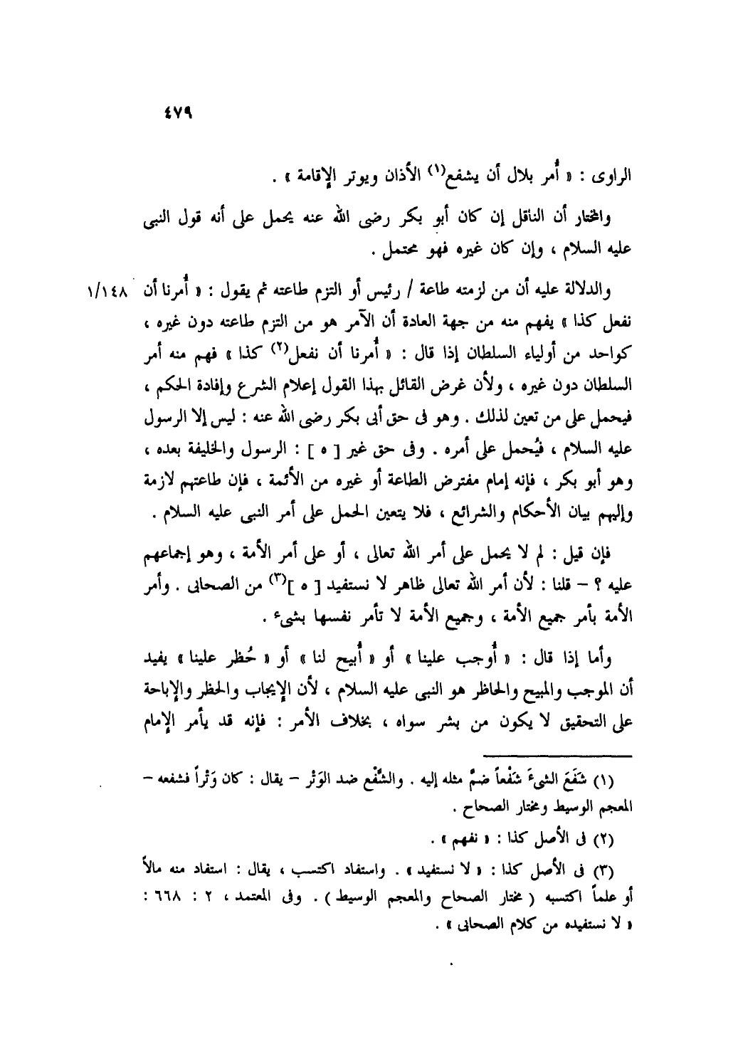 والدلالة عليه أن من لزمته طاعة رئيس أو التزم طاعته ثم يقول: "أمرنا أن نفعل كذا" يفهم منه من جهة العادة أن الآمر هو من التزم طاعته دون غيره، كواحد من أولياء السلطان إذا قال: "أمرنا أن نفعل كذا" فهم منه أمر السلطان دون غيره، ولأن غرض القائل بهذا القول إعلام الشرع وإفادة الحكم، فيحمل على من تعين لذلك. وهو في حق أبي بكر رضي الله عنه: ليس إلا الرسول عليه السلام، فيحمل على أمره. وفى حق غير [هـ]: الرسول والخليفة بعده، وهو أبو بكر، فإنه إمام مفترض الطاعة أو غيره من الأئمة، فإن طاعتهم لازمة وإليهم بيان الأحكام والشرائع، فلا يتعين الحمل على أمر النبي عليه السلام.