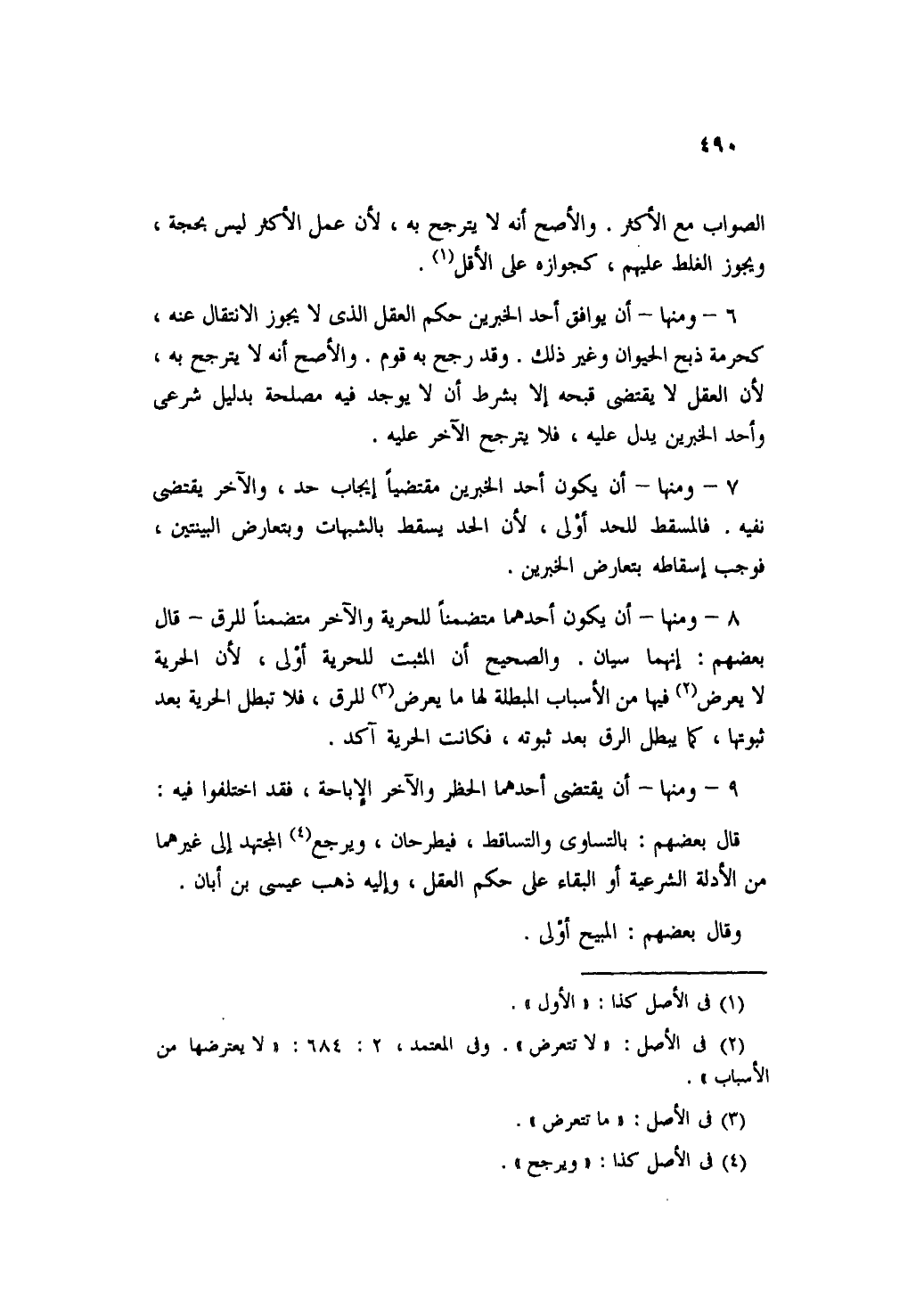٩ - ومنها- أن يقتضى أحدهما الحظر والآخر الإباحة، فقد اختلفوا فيه: قال بعضهم: بالتساوي والتساقط، فيطرحان، ويرجع المجتهد إلى غيرها من الأدلة الشرعية أو البقاء على حكم العقل، وإليه ذهب عيسى بن أبان.