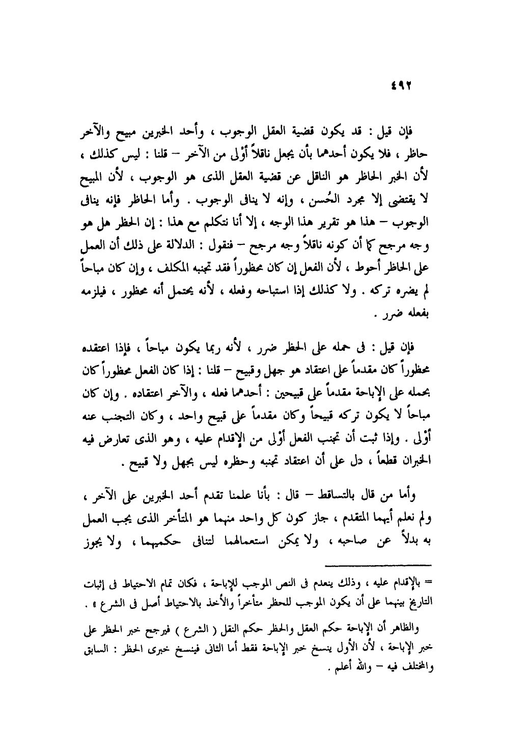 فإن قيل: قد يكون قضية العقل الوجوب، وأحد الخبرين مبيح والآخر حاظر، فلا يكون أحدهما بأن يجعل ناقلاً أولى من الآخر- قلنا: ليس كذلك، لأن الخبر الحاظر هو الناقل عن قضية العقل الذي هو الوجوب، لأن المبيح لا يقتضى إلا مجرد الحسن، وإنه لا ينافى الوجوب. وأما الحاظر فإنه ينافى الوجوب- هذا هو تقرير هذا الوجه، إلا أنا نتكلم مع هذا: إن الحظر هل هو وجه مرجح كما أن كونه ناقلاً وجه مرجح- فنقول: الدلالة على ذلك أن العمل على الحاظر أحوط، لأن الفعل إن كان محظوراً فقد تجنبه المكلف، وإن كان مباحاً لم يضره تركه. ولا كذلك إذا استباحه وفعله، لأنه يحتمل أنه محظور، فيلزمه بفعله ضرر.