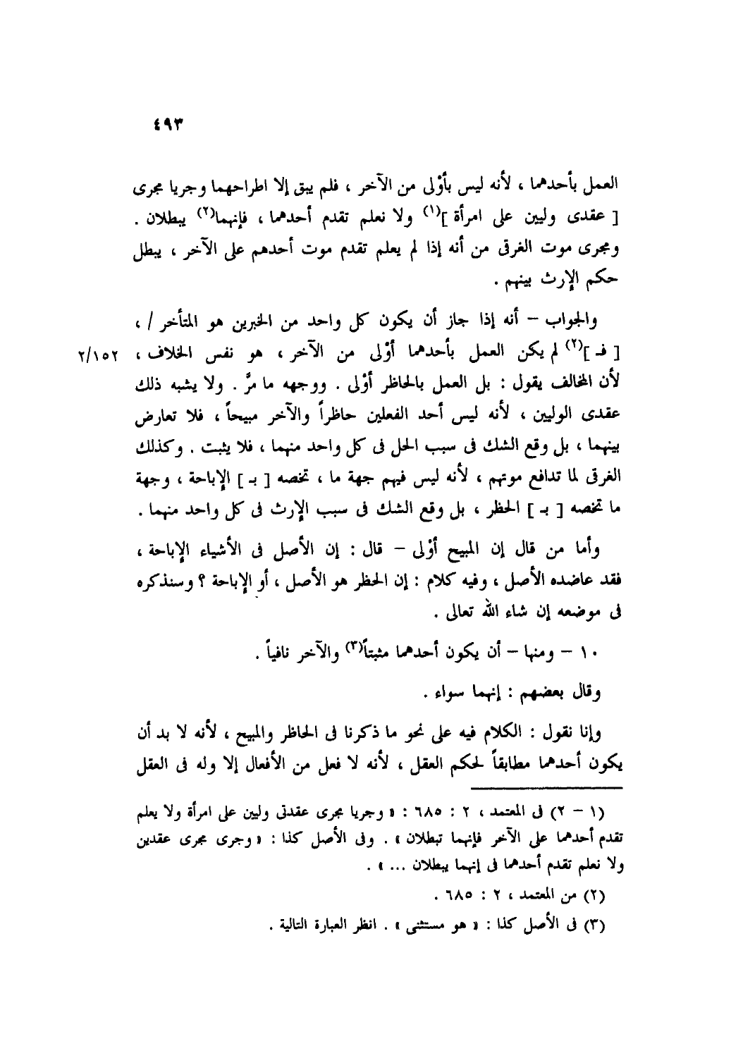 والجواب- أنه إذا جاز أن يكون كل واحد من الخبرين هو المتأخر، [ف] لم يكن العمل بأحدهما أولى من الآخر، هو نفس الخلاف، لأن المخالف يقول: بل العمل بالحاظر أولى. ووجهه ما مر. ولا يشبه ذلك عقدي الوليين، لأنه ليس أحد الفعلين حاظراً والآخر مبيحاً، فلا تعارض بينهما، بل وقع الشك في سبب الحل في كل واحد منهما، فلا يثبت. وكذلك الغرقى لما تدافع موتهم، لأنه ليس فيهم جهة ما، تخصه [ب] الإباحة، وجهة ما تخصه [ب] الحظ، بل وقع الشك في سبب الإرث في كل واحد منهما.