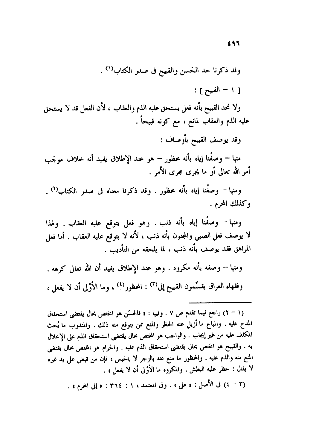 ومنها- وصفه بأنه مكروه. وهو عند الإطلاق يفيد أن الله تعالى كرهه. وفقهاء العراق يقسمون القبيح إلى: المحظور، وما الأولى أن لا يفعل،