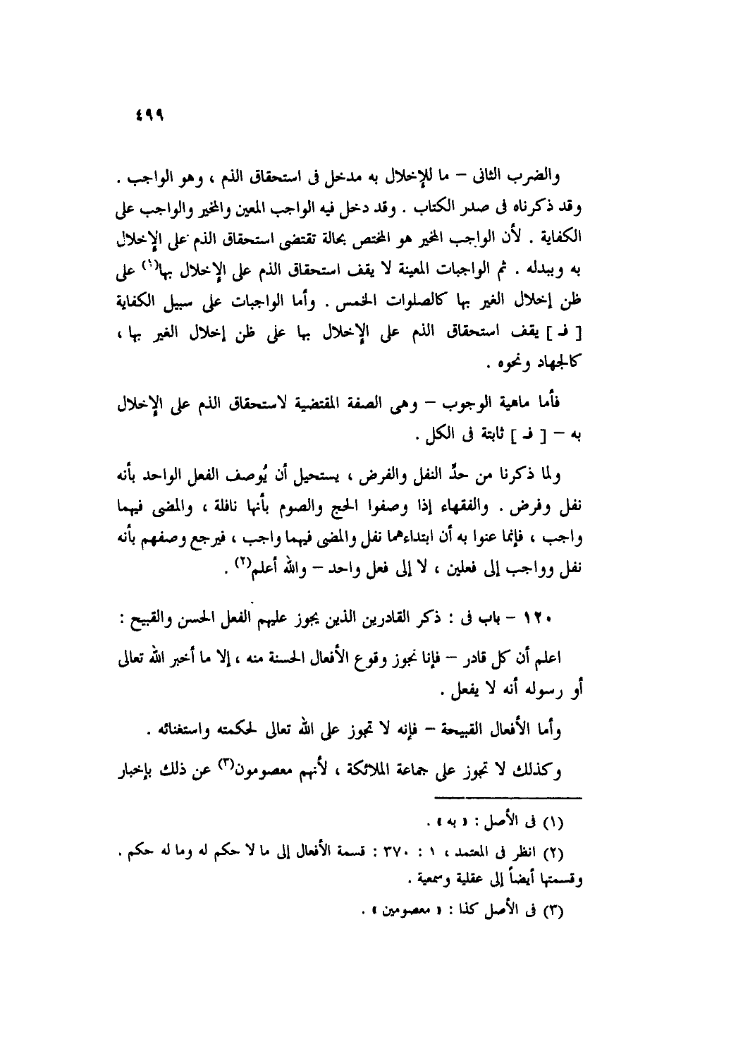 والضرب الثاني- ما للإخلال به مدخل في استحقاق الذم، وهو الواجب. وقد ذكرناه في صدر الكتاب. وقد دخل فيه الواجب المعين والمخبر والواجب على الكفاية. لأن الواجب المخير هو المختص بحالة تقتضى استحقاق الذم على الإخلال به ويبدله. ثم الواجبات المعينة لا يقف استحقاق الذم على الإخلال بها على ظن إخلال الغير بها كالصلوات الخمس. وأما الواجبات على سبيل الكفاية [ف] يقف استحقاق الذم على الإخلال بها على ظن إخلال الغير بها، كالجهاد ونحوه.