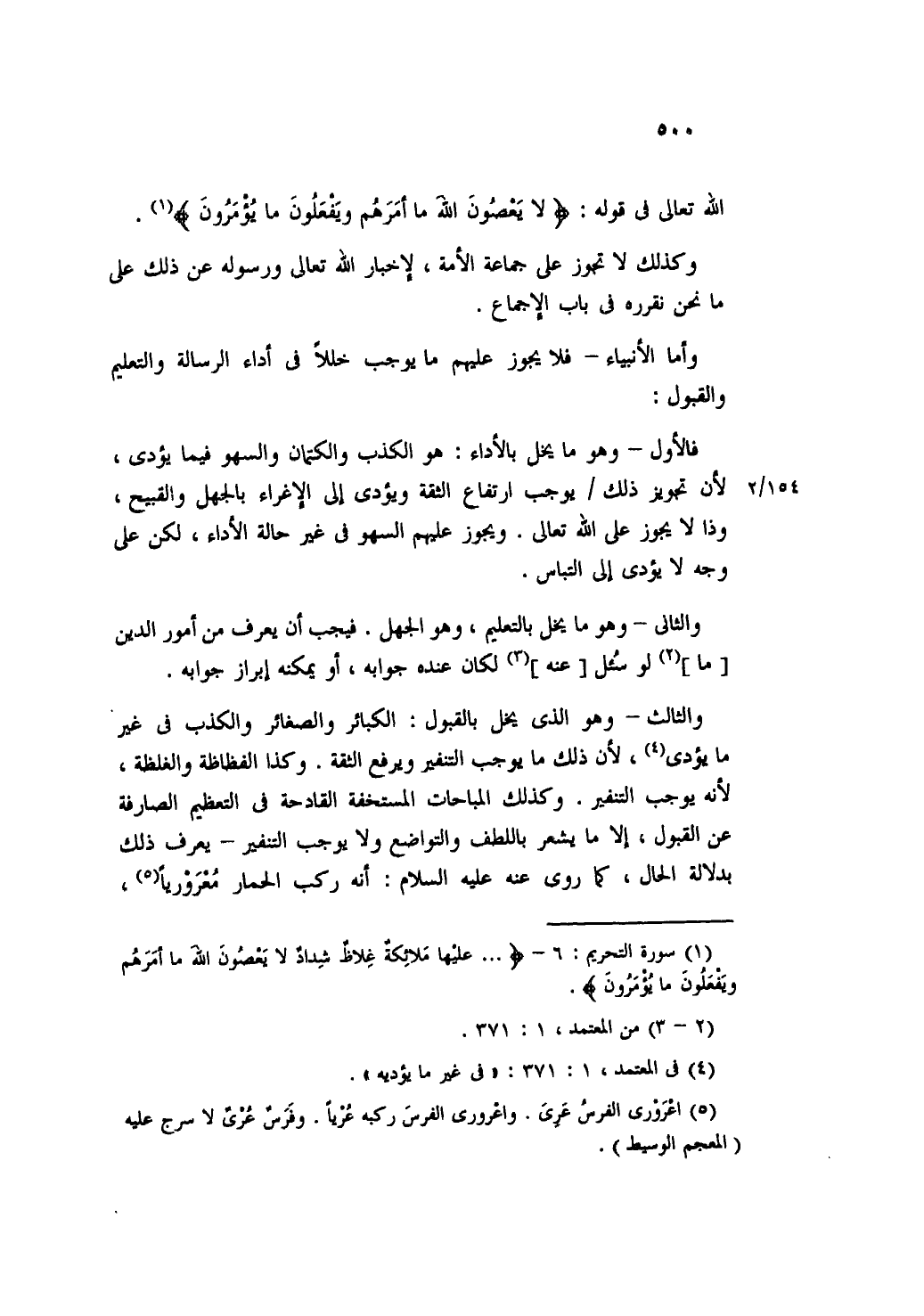 فالأول- وهو ما يخل بالأداء: هو الكذب والكتمان والسهو فيما يؤدى، لأن تجويز ذلك يوجب ارتفاع الثقة ويؤدى إلى الإغراء بالجهل والقبيح، وذا لا يجوز على الله تعالى. ويجوز عليهم السهو في غير حالة الأداء، لكن على وجه لا يؤدى إلى التباس.
