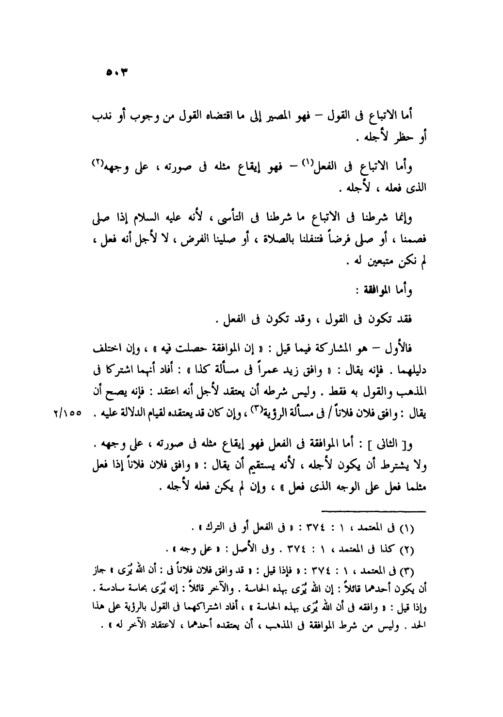 و[الثاني]: أما الموافقة في الفعل فهو إيقاع مثله في صورته، على وجهه. ولا يشترط أن يكون لأجله، لأنه يستقيم أن يقال: "وافق فلان فلاناً إذا فعل مثلما فعل على الوجه الذي فعل"، وإن لم يكن فعله لأجله.
