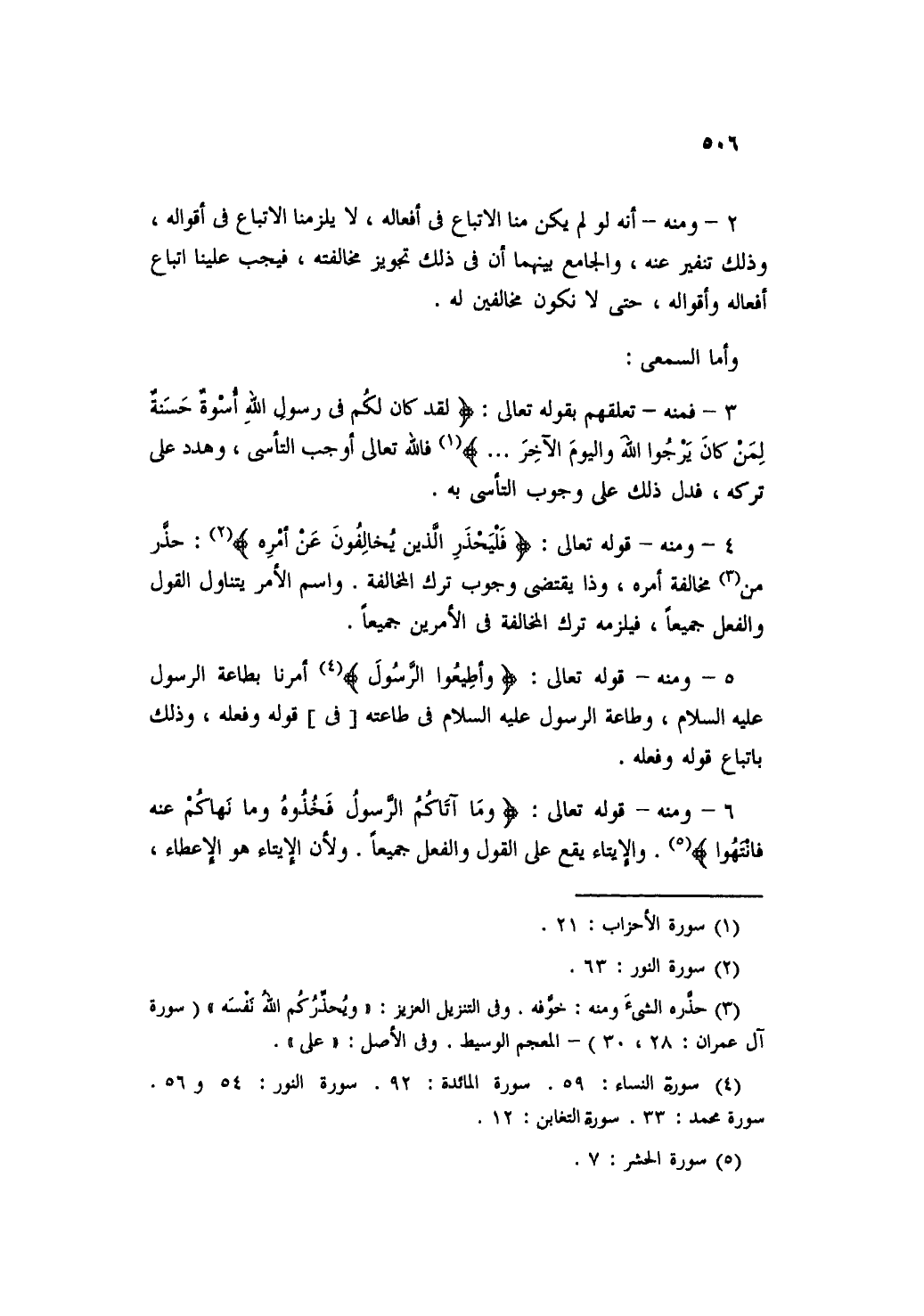 ٥ - ومنه- قوله تعالى: [وَأَطِيعُوا الرَّسُولَ] أمرنا بطاعة الرسول عليه السلام، وطاعة الرسول عليه السلام في طاعته [ف] قوله وفعله، وذلك بإتباع قوله وفعله.