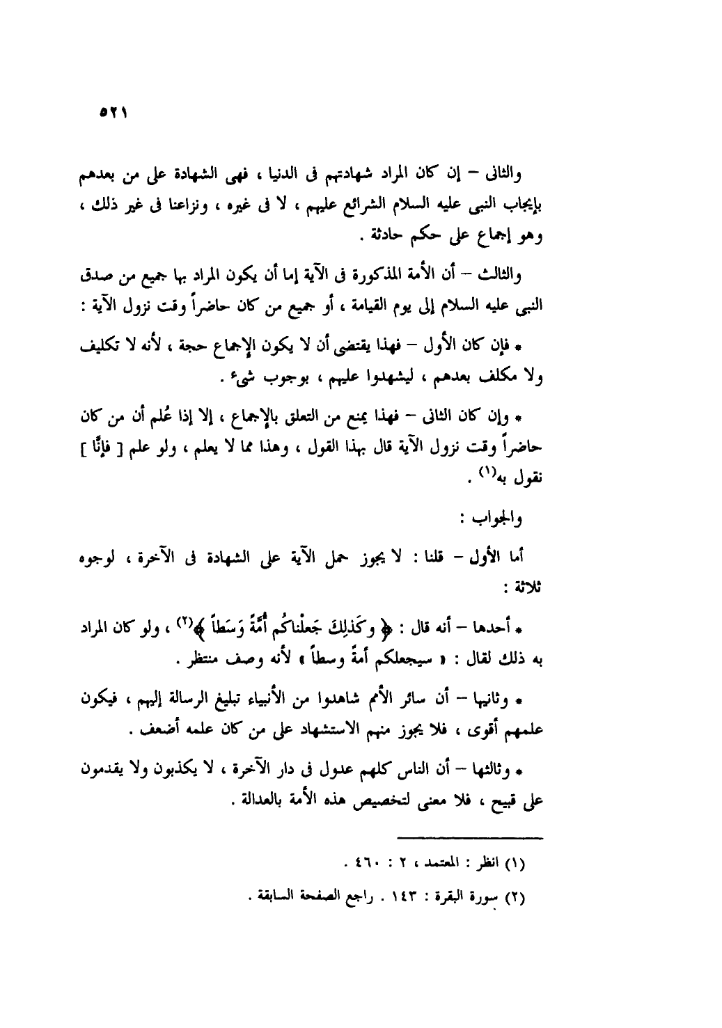 والثاني- إن كان المراد شهادتهم في الدنيا، فهي الشهادة على من بعدهم بإيجاب النبي عليه السلام الشرائع عليهم، لا في غيره، ونزاعنا في غير ذلك، وهو إجماع على حكم حادثة.