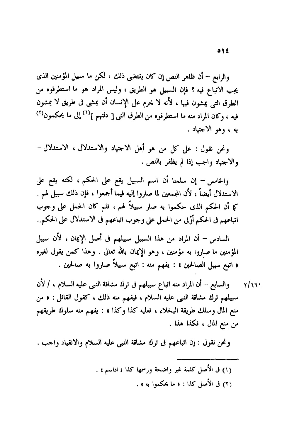 والرابع- أن ظاهر النص إن كان يقتضى ذلك، لكن ما سبيل المؤمنين الذي يجب الإتباع فيه؟ فإن السبيل هو الطريق، وليس المراد هو ما استطرقوه من الطرق التي يمشون فيها، لأنه لا يحرم على الإنسان أن يمشي في طريق لا يمشون فيه، وكان المراد منه ما استطرقوه من الطرق التي [دلتهم] إلى ما يحكمون به، وهو الاجتهاد.