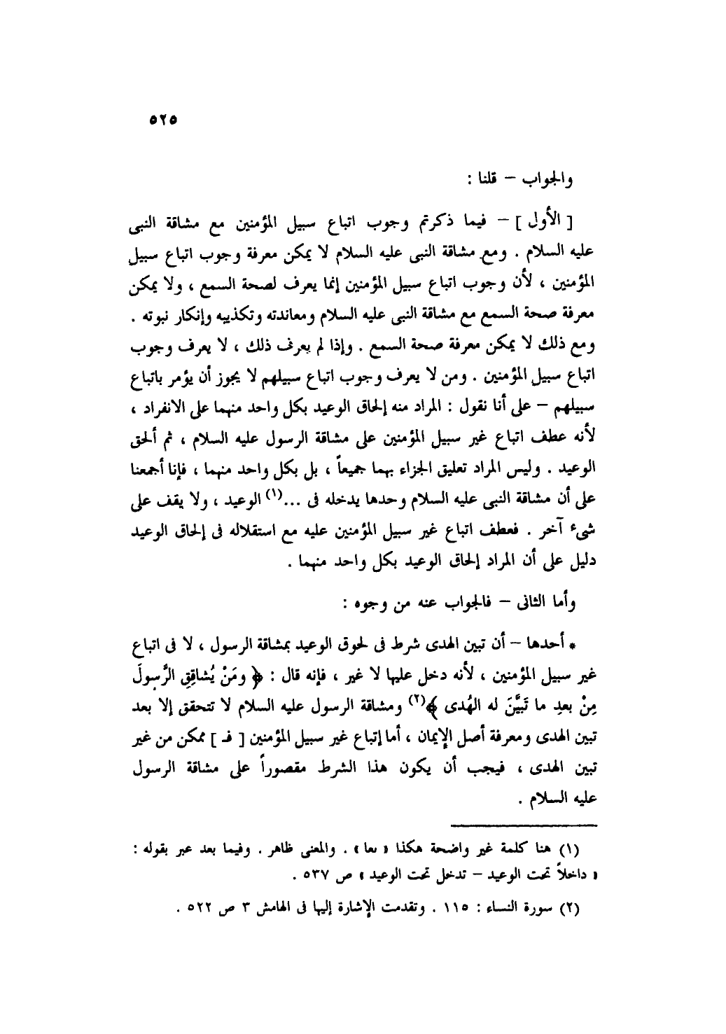 [الأول]- فيما ذكرتم وجوب إتباع سبيل المؤمنين مع مشاقة النبي عليه السلام. ومع مشاقة النبي عليه السلام لا يمكن معرفة وجوب إتباع سبيل المؤمنين، لأن وجوب إتباع سبيل المؤمنين إنما يعرف لصحة السمع، ولا يمكن معرفة صحة السمع مع مشاقة النبي عليه السلام ومعاندته وتكذيبه وإنكار نبوته. ومع ذلك لا يمكن معرفة صحة السمع. وإذا لم يعرف ذلك، لا يعرف وجوب إتباع سبيل المؤمنين. ومن لا يعرف وجوب إتباع سبيلهم لا يجوز أن يؤمر بإتباع سبيلهم- على أنا نقول: المراد منه إلحاق الوعيد بكل واحد منهما على الانفراد، لأنه عطف إتباع غير سبيل المؤمنين على مشاقة الرسول عليه السلام، ثم ألحق الوعيد. وليس المراد تعليق الجزاء بهما جميعاً، بل بكل واحد منهما، فإنا أجمعنا على أن مشاقة النبي عليه السلام وحدها يدخله في ... الوعيد، ولا يقف على شيء آخر. فعطف إتباع غير سبيل المؤمنين عليه مع استقلاله في إلحاق الوعيد دليل على أن المراد إلحاق الوعيد بكل واحد منهما.