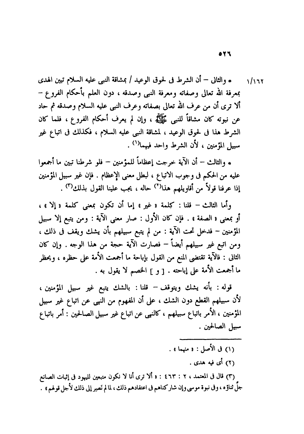 * والثاني- أن الشرط في لحوق الوعيد بمشاقة النبي عليه السلام تبين الهدى بعرفة الله تعالى وصفاته ومعرفة النبي وصدقه، دون العلم بأحكام الفروع- ألا ترى أن من عرف الله تعالى بصفاته وعرف النبي عليه السلام وصدقه ثم حاد عن نبوته كان مشاقاً للنبي صلي الله عليه وسلم، وإن لم يعرف أحكام الفروع، فلما كان الشرط هذا في لحوق الوعيد، لمشاقة النبي عليه السلام، فكذلك في إتباع غير سبيل المؤمنين، لأن الشرط واحد فيهما.