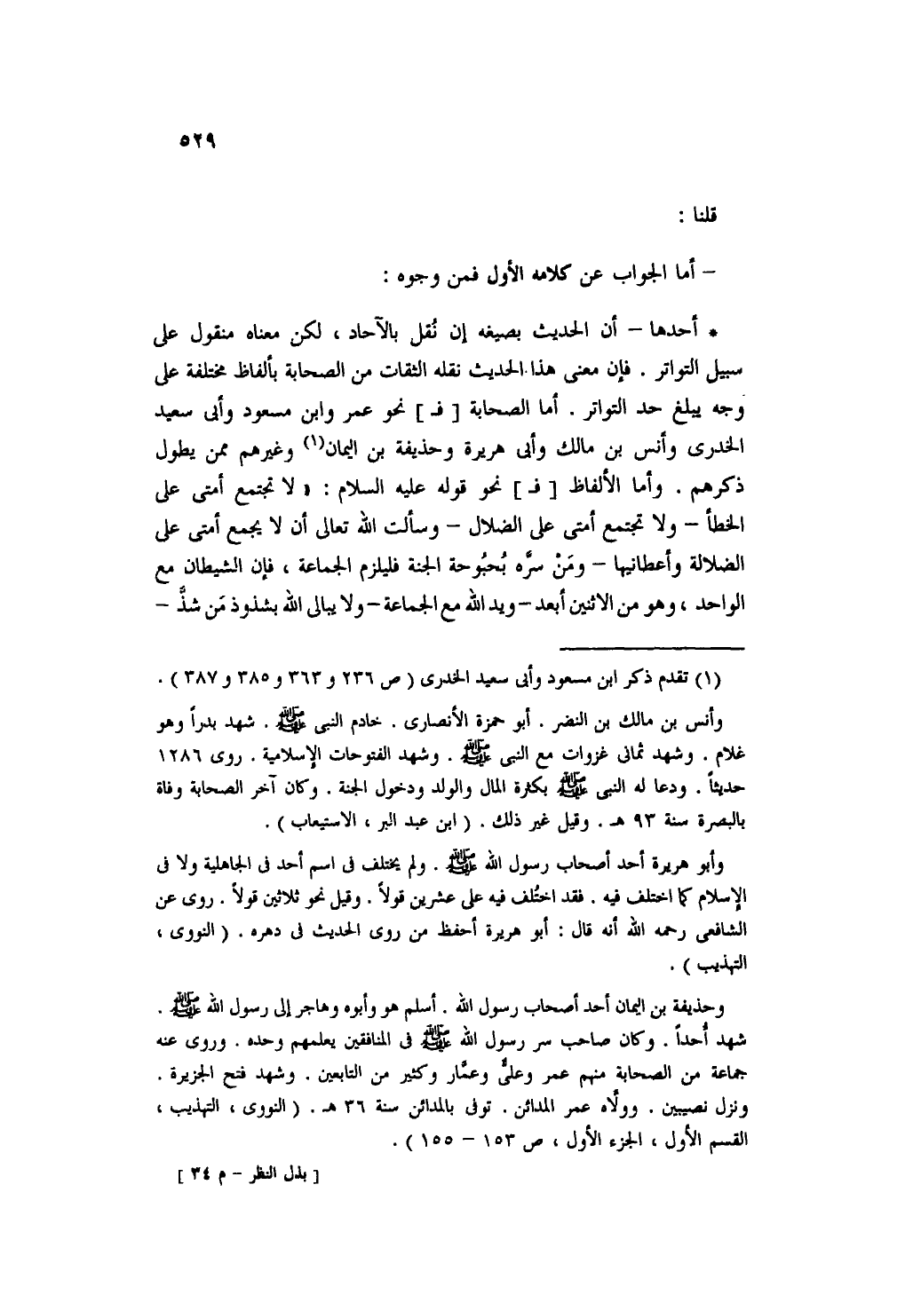 * أحدها- أن الحديث بصيغه إن نقل بالآحاد، لكن معناه منقول على سبيل التواتر. فإن معنى هذا الحديث نقله الثقات من الصحابة بألفاظ مختلفة على وجه يبلغ حد التواتر. أما الصحابة [ف] نحو عمر وابن مسعود وأبى سعيد الخدرى وأنس بن مالك وأبى هريرة وحذيفة بن اليمان وغيرهم ممن يطول ذكرهم. وأما الألفاظ [ف] نحو قوله عليه السلام: "لا تجتمع أمتي على الخطأ- ولا تجتمع أمتي على الضلال- وسألت الله تعالى أن لا يجمع أمتي على الضلالة وأعطانيها- ومن سره بحبوحة الجنة فليلزم الجماعة، فإن الشيطان مع الواحد، وهو من الاثنين أبعد- ويد الله مع الجماعة- ولا يبالي الله بشذوذ من شذ-