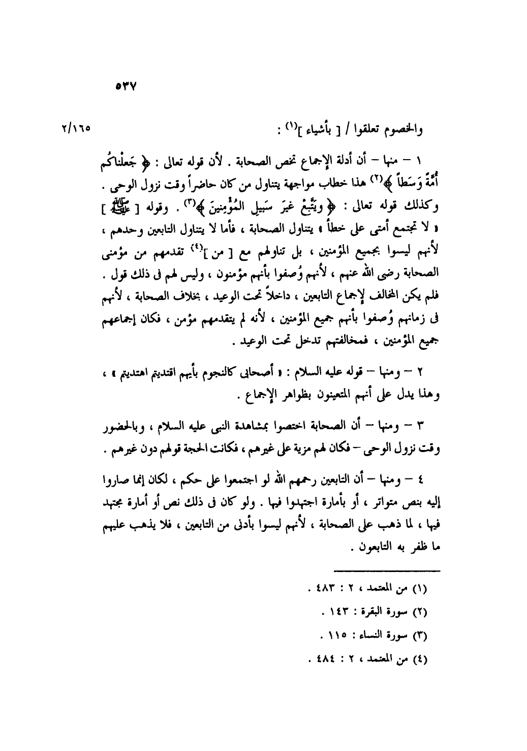 ٤ - ومنها- أن التابعين رحمهم الله لو اجتمعوا على حكم، لكان إنما صاروا إليه بنص متواتر، أو بأمارة اجتهدوا فيها. ولو كان في ذلك نص أو أمارة مجتهد فيها، لما ذهب على الصحابة، لأنهم ليسوا بأدنى من التابعين، فلا يذهب عليهم ما ظفر به التابعون.