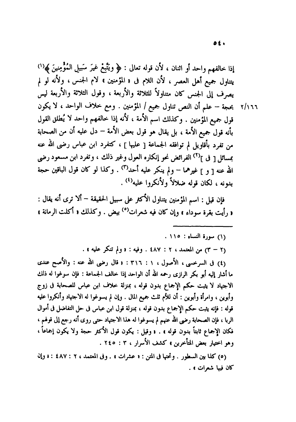 إذا خالفهم واحد أو اثنان، لأن قوله تعالى: {وَيَتَّبِعْ غَيْرَ سَبِيلِ الْمُؤْمِنِينَ} يتناول جميع أهل العصر، لأن اللام في "المؤمنين" لام الجنس، ولأنه لو لم يصرف إلى الجنس كان متناولاً للثلاثة والأربعة، وقول الثلاثة والأربعة ليس بحجة - علم أن النص تناول جميع المؤمنين. ومع خلاف الواحد، لا يكون قول جميع المؤمنين. وكذلك أسم الأمة، لأنه إذا خالفهم واحد لا يطلق القول بأنه قول جميع الأمة، بل يقال هو قول بعض الأمة - دل عليه أن من الصحابة من تفرد بأقاويل لم توافقه الجماعة [عليها]، كتفرد ابن عباس رضي الله عنه بمسائل [في] الفرائض نحو إنكاره العول وغير ذلك، وتفرد ابن مسعود رضي الله عنه [و] غيرهما- ولم ينكر عليه أحد. وكذا لو كان قول الباقين حجة بدونه، لكان قوله ضلالاً ولأنكروا عليه.