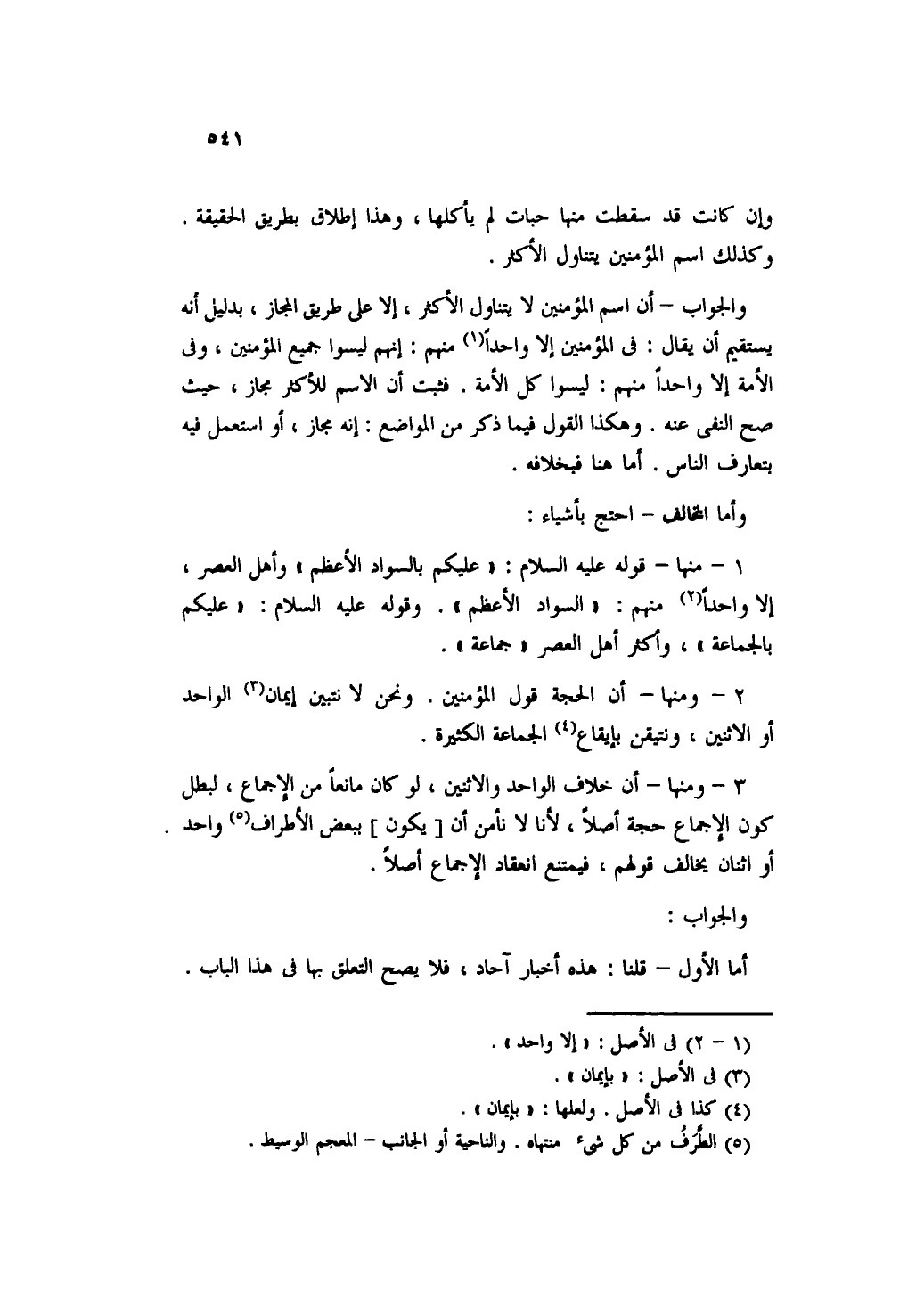 والجواب- أن اسم المؤمنين لا يتناول الأكثر، إلا على طريق المجاز، بدليل أنه يستقيم أن يقال: في المؤمنين إلا واحداً منهم: إنهم ليسوا جميع المؤمنين، وفي الأمة إلا واحداً منهم: ليسوا كل الأمة. فثبت أن الاسم للأكثر مجاز، حيث صح النفي عنه. وهكذا القول فيما ذكر من المواضع: أنه مجاز، أو استعمل فيه بتعارف الناس. أما هنا فبخلافه.