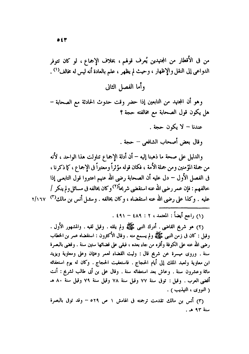 والدليل على صحة ما ذهبنا إليه- أن أدلة الإجماع تناولت هذا الواحد، لأنه من جملة المؤمنين ومن جملة الأمة، فكان قوله مؤثراُ ومعتبراُ في الإجماع، كما ذكرنا، في الفصل الأول- دل عليه أن الصحابة رضي الله عنهم اعتبروا قول التابعي إذا خالفهم: فإن عمر رضي الله عنه استقضى شريحاً وكان يخالفه في مسائل ولم ينكر عليه. وكذا علي رضي الله استقضاه، وكان يخالفه. وسئل أنس بن مالك