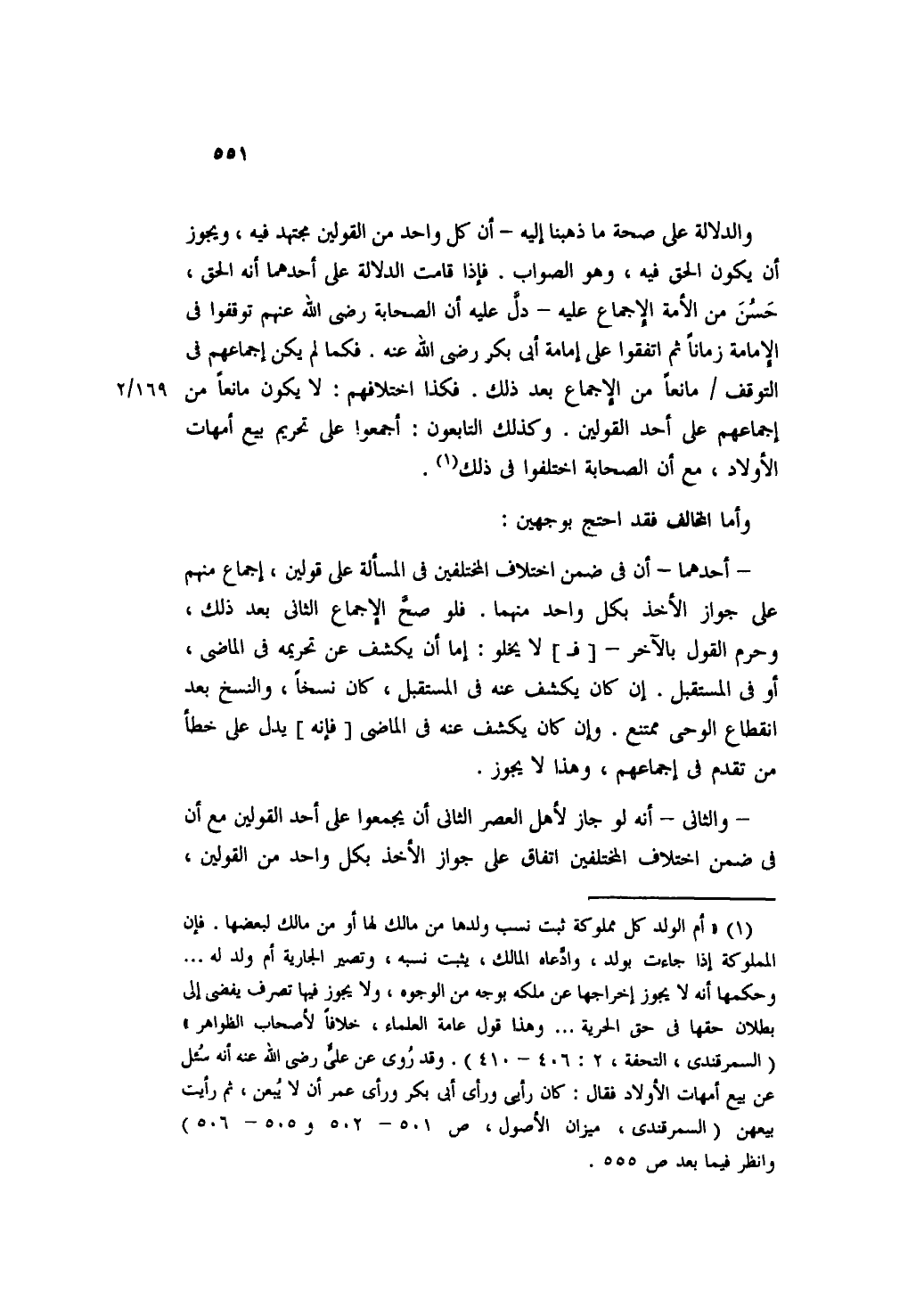 والدلالة على صحة ما ذهبنا إليه- أن كل واحد من القولين مجتهد فيه، ويجوز أن يكون الحق فيه، وهو الصواب. فإذا قامت الدلالة على أحدهما أنه الحق، حسن من الأمة الإجماع عليه- دل عليه أن الصحابة رضي الله عنهم توقفوا في الإمامة زماناً ثم اتفقوا على إمامة أبى بكر رضي الله عنه. فكما لم يكن إجماعهم في التوقف مانعاً من الإجماع بعد ذلك. فكذا اختلافهم: لا يكون مانعاً من إجماعهم على أحد القولين. وكذلك التابعون: أجمعوا على تحريم بيع أمهات الأولاد، مع أن الصحابة اختلفوا في ذلك.