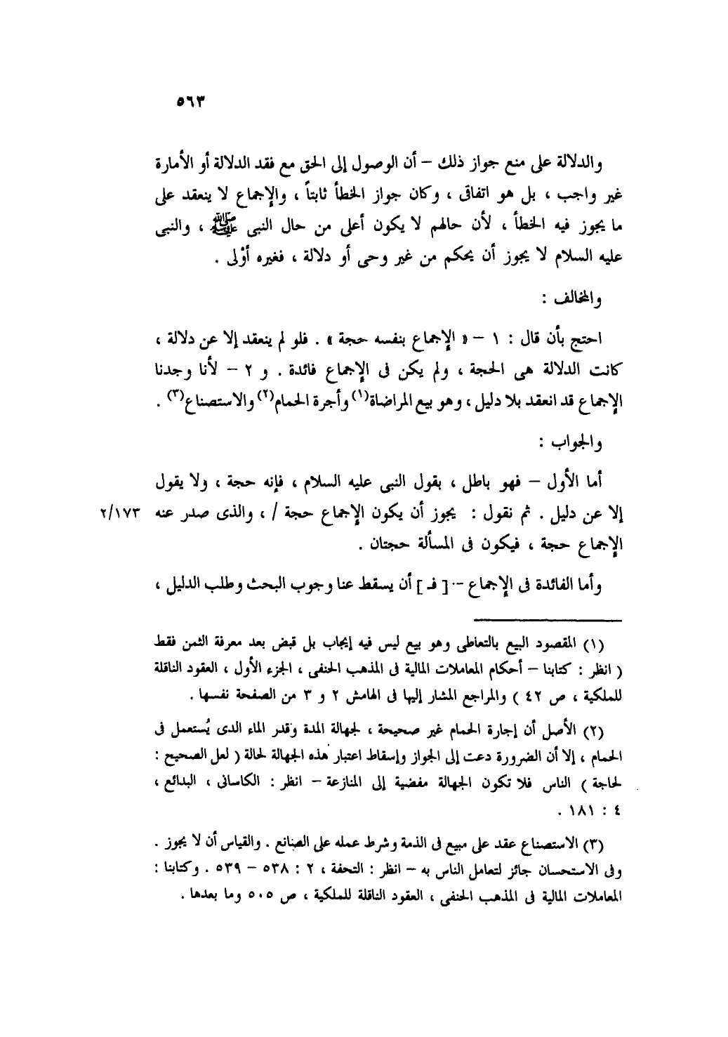 احتج بأن قال: ١ - " الإجماع بنفسه حجة". فلو لم ينعقد إلا عن دلالة، كانت الدلالة هي الحجة، ولم يكن في الإجماع فائدة. و ٢ - لأنا وجدنا الإجماع قد انعقد بلا دليل، وهو بيع المراضاة وأجرة الحمام والاستصناع.