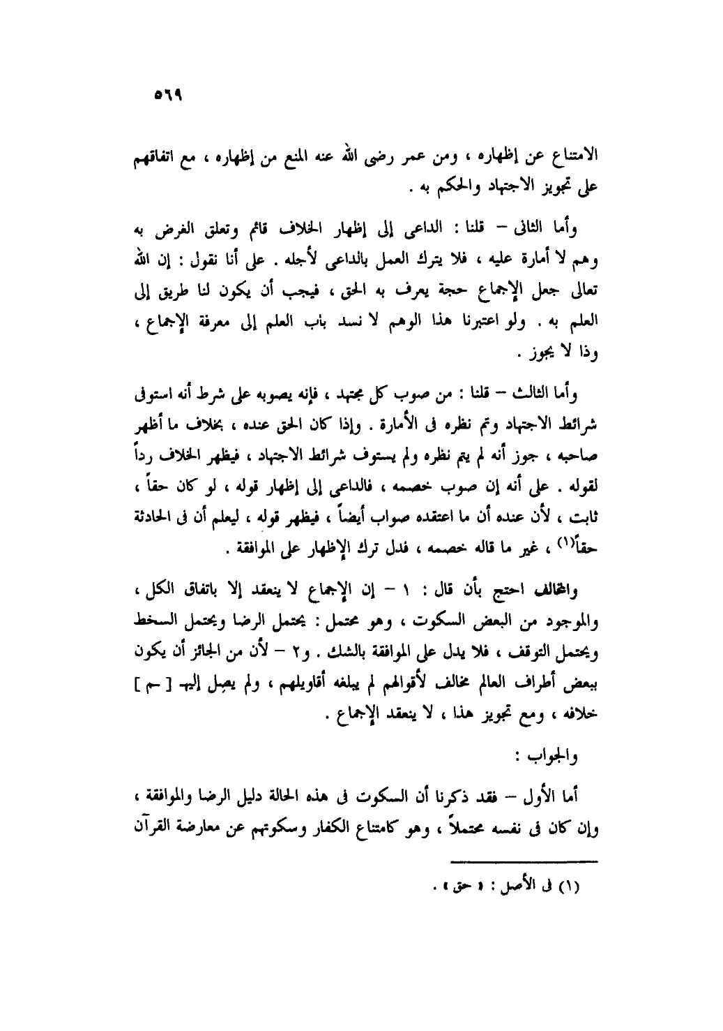 وأما الثاني- قلنا: الداعي إلى إظهار الخلاف قائم وتعلق الغرض به وهم لا أمارة عليه، فلا يترك العمل بالداعي لأجله. على أنا نقول: إن الله تعالى جعل الإجماع حجة يعرف به الحق، فيجب أن يكون لنا طريق إلى العلم به. ولو اعتبرنا هذا الوهم لا نسد باب العلم إلى معرفة الإجماع، وذا لا يجوز.