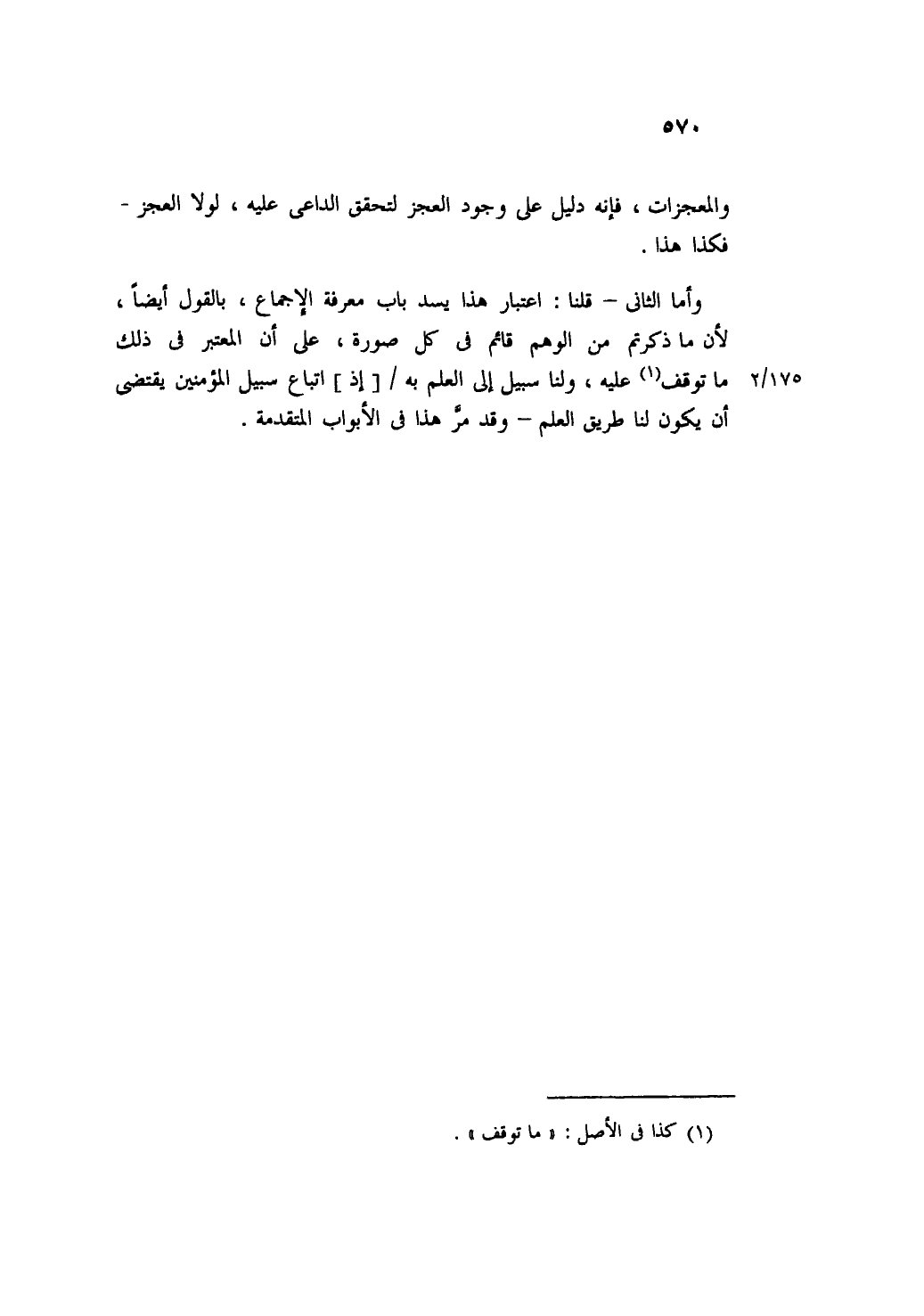 وأما الثاني- قلنا: اعتبار هذا يسد باب معرفة الإجماع، بالقول أيضاً، لأن ما ذكرتم من الوهم قائم في كل صورة، على أن المعتبر في ذلك ما توقف عليه، ولنا سبيل إلى العلم به [إذ] إتباع سبيل المؤمنين يقتضى أن يكون لنا طريق العلم- وقد مر هذا في الأبواب المتقدمة.