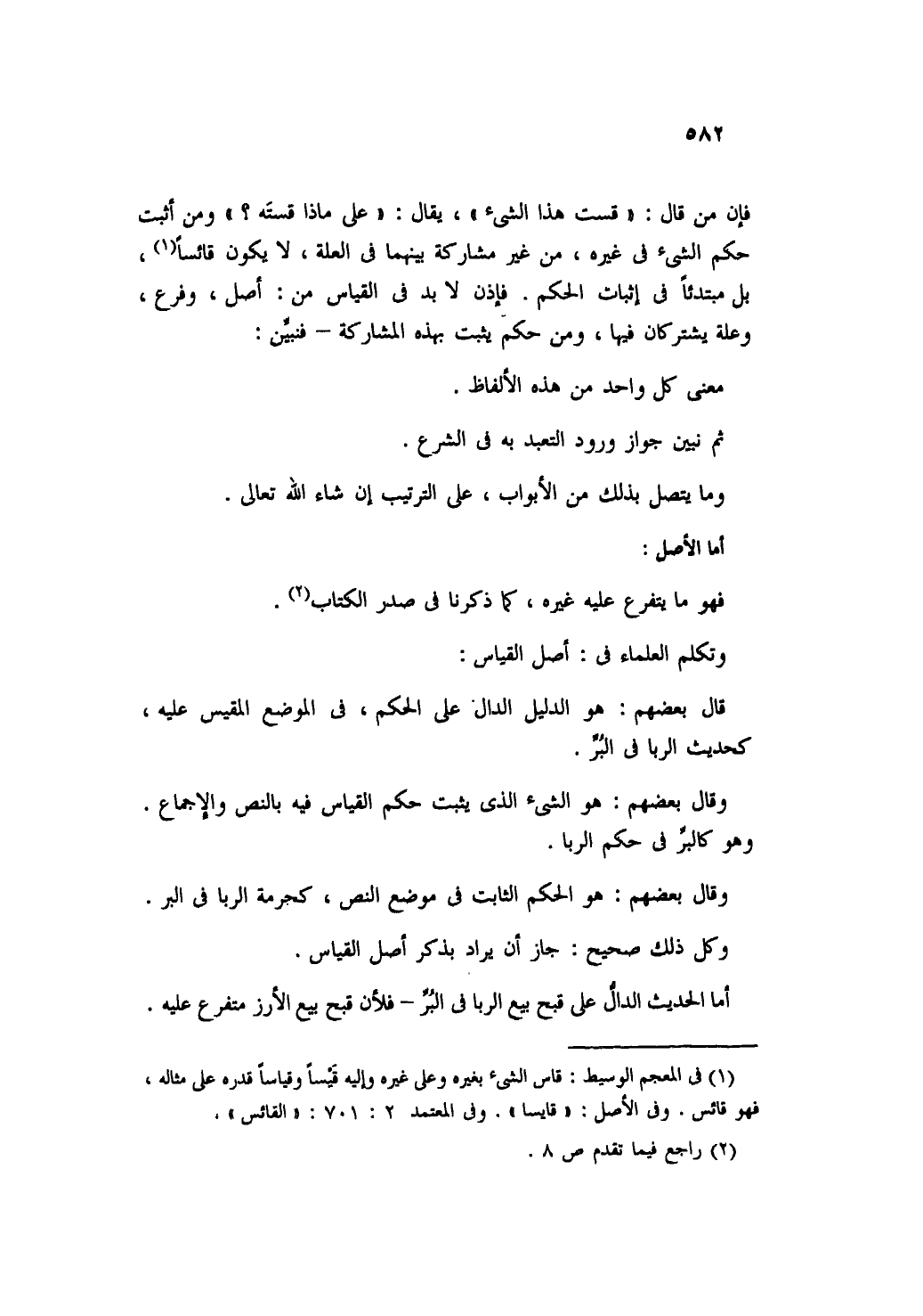 فإنما من قال: " قست هذا الشيء"، يقال: " على ماذا قسته؟ " ومن أثبت حكم الشيء في غيره، من غير مشاركة بينهما في العلة، لا يكون قائساً، بل مبتدئاً في إثبات الحكم. فإذن لا بد في القياس من: أصل، وفرع، وعلة يشتركان فيها، ومن حكم يثبت بهذه المشاركة- فنبين: