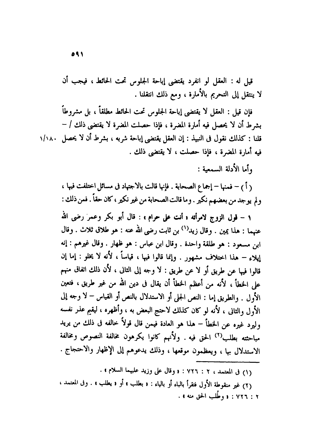 ١ - قول الزوج لامرأته"أنت على حرام": قال أبو بكر وعمر رضي الله عنهما: هذا يمين. وقال زيد بن ثابت رضي الله عنه: هو طلاق ثلاث. وقال ابن مسعود: هو طلقة واحدة. وقال ابن عباس: هو ظهار. وقال غيرهم: إنه إيلاء- هذا اختلاف مشهور. وإنما قالوا فيها، قياساً، لأنه لا يخلو: إما إن قالوا فيها عن طريق أو لا عن طريق: لا وجه إلى الثاني، لأن ذلك اتفاق منهم على الخطأ، لأنه من أعظم الخطأ أن يقال في دين الله من غير طريق، فتعين الأول. والطريق إما: النص الجلي أو الاستدلال بالنص أو القياس- لا وجه إلى الأول والثاني، لأنه لو كان كذلك لاحتج البعض به، وأظهره، ليقيم عذر نفسه وليرد غيره عن الخطأ- هذا هو العادة فيمن قال قولاً خالفه في ذلك من يريد مباحثته بطل الحق فيه. ولأنهم كانوا يكرهون مخالفة النصوص ومخالفة الاستدلال بها، ويعظمون موقعها، وذلك يدعوهم إلى الإظهار والاحتجاج.