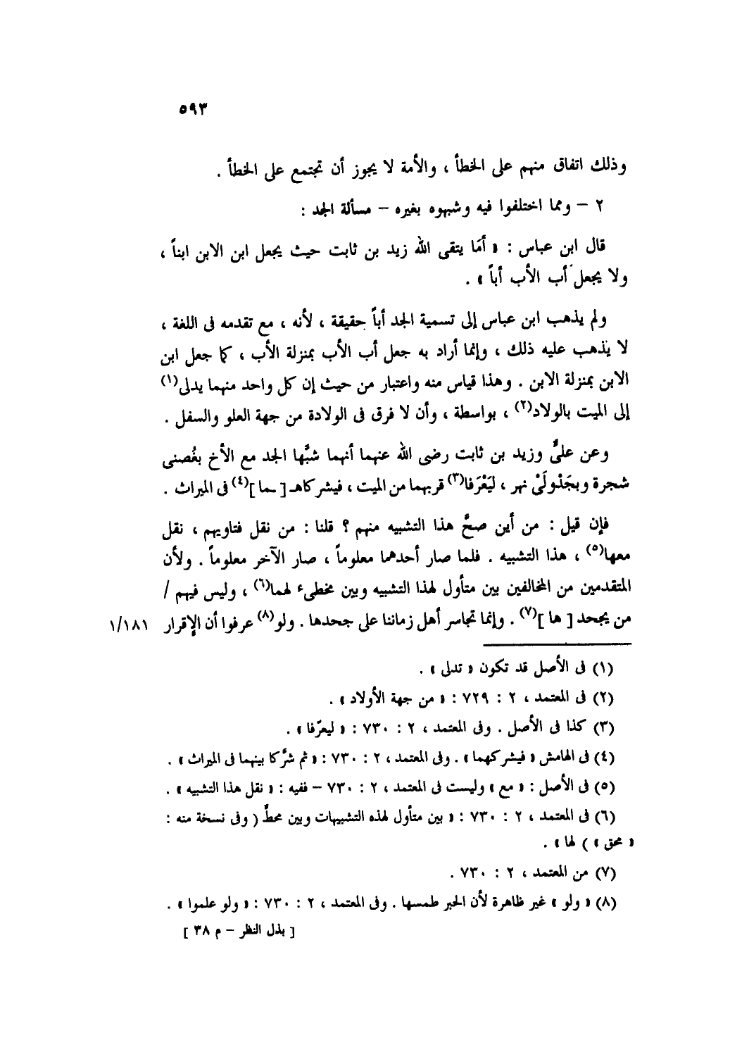 ولم يذهب ابن عباس إلى تسمية الجد أباً حقيقة، لأنه، مع تقدمه في اللغة، لا يذهل عليه ذلك، وإنما أراد به جعل أب الأب بمنزلة الأب، كما جعل ابن الابن بمنزلة الابن. وهذا قياس منه واعتبار من حيث إن كل واحد منهما يدلى إلى الميت بالولاد، بواسطة، وأن لا فرق في الولادة من جهة العلو والسفل.