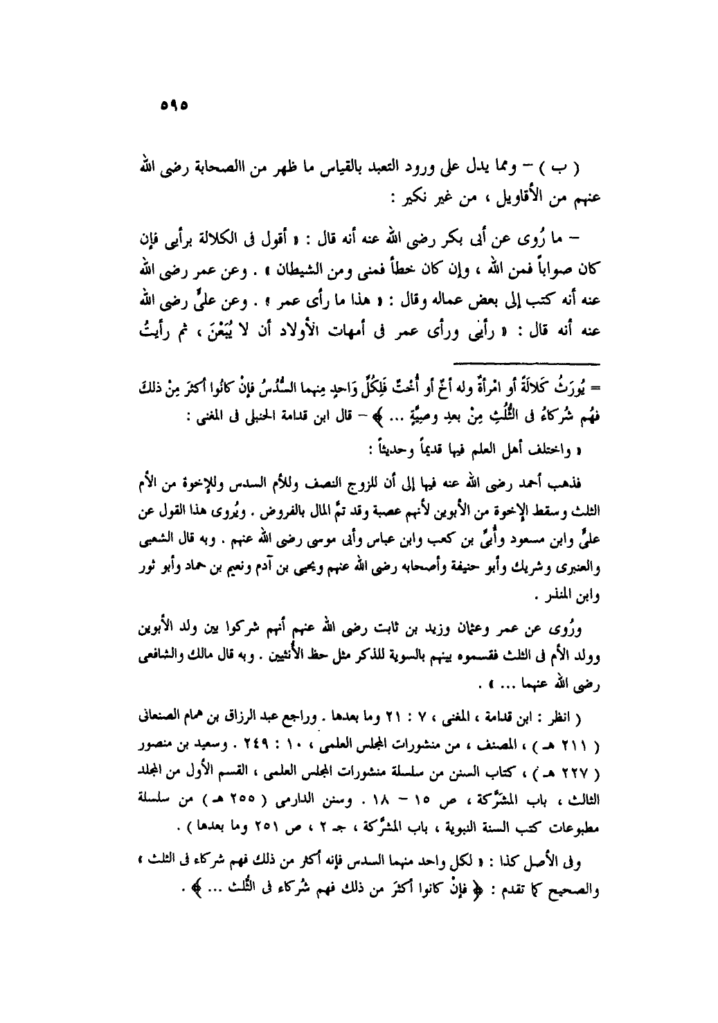 (ب) - ومما يدل على ورود التعبد بالقياس ما ظهر من الصحابة رضي الله عنهم من غير نكير: