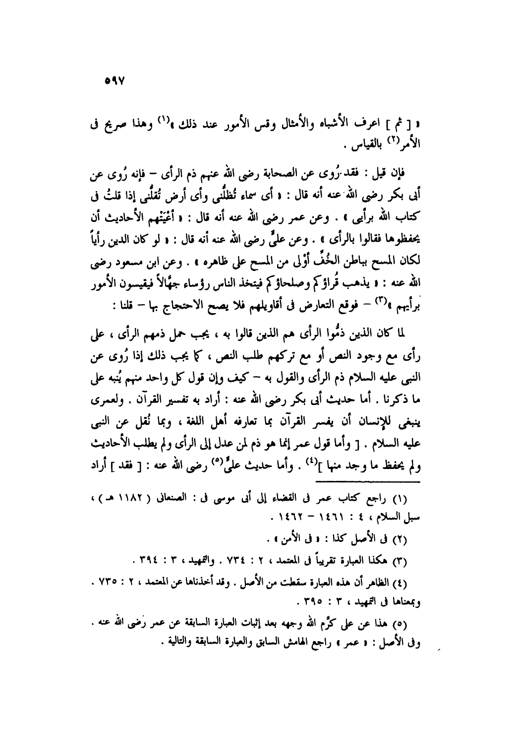 لما كان الذين ذموا الرأي هم الذين قالوا به، يجب حمل ذمهم الرأي، على رأي مع وجود النص أو مع تركهم طلب النص، كما يجب ذلك إذا روي عن النبي عليه السلام ذم الرأي والقول به- كيف وإن قول كل واحد منهم ينبه على ما ذكرنا. أما حديث أبى بكر رضي الله عنه: أراد به تفسير القرآن. ولعمري ينبغي للإنسان أن يفسر القرآن بما تعارفه أهل اللغة، وبما نقل عن النبي عليه السلام [وأما قول عمر غنما هو ذم لم عدل إلى الرأي ولم يطلب الأحاديث ولم يحفظ ما وجد منها]. وأما حديث علي رضي الله عنه: [فقد] أراد