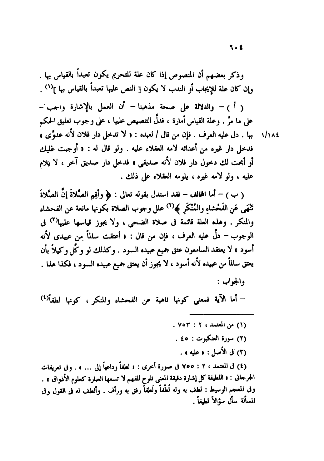 (أ) - والدلالة على صحة مذهبنا- أن العمل بالإشارة واجب- على ما مر. وعلة القياس أمارة، فدل التنصيص عليها، على وجوب تعليق الحكم بها. دل عليه العرف. فإن من قال لعبده: "لا تدخل دار فلان لأنه عدوى" فدخل دار غيره من أعدائه لامه العقلاء عليه. ولو قال له: "أوجبت عليك أو أبحت لك الدخول دار فلان لأنه صديقي" فدل دار صديق آخر، لا يلام عليه، ولو لامه غيره، يلومه العقلاء على ذلك.