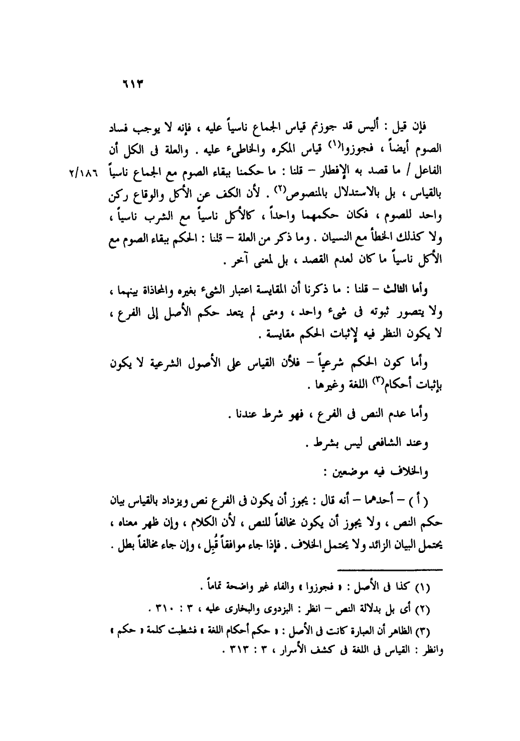 وأما الثالث- قلنا: ما ذكرنا أن المقايسة اعتبار الشيء بغيره والمحاذاة بينهما، ولا يتصور ثبوته في شيء واحد، ومتى لم يتعد حكم الأصل إلى الفرع، لا يكون النظر فيه لإثبات الحكم مقايسة.