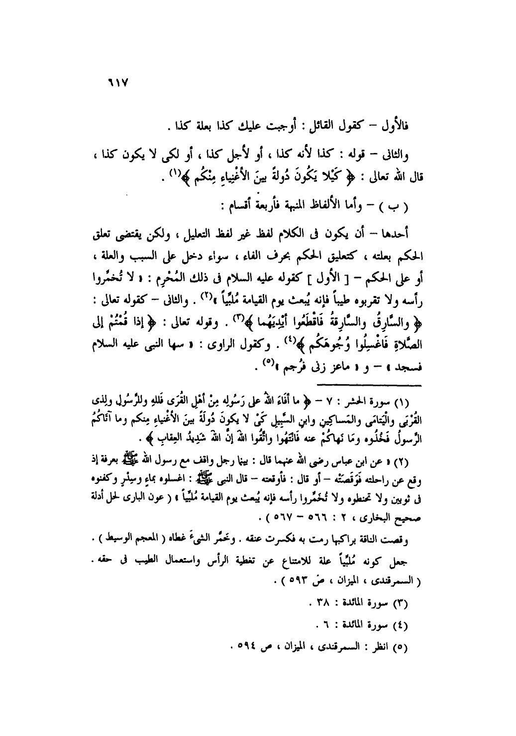 والثاني- قوله: كذا لأنه كذا، أو لأجل كذا، أو لكي لا يكون كذا، قال الله تعالى: {كَيْ لَا يَكُونَ دُولَةً بَيْنَ الْأَغْنِيَاءِ مِنْكُمْ}.