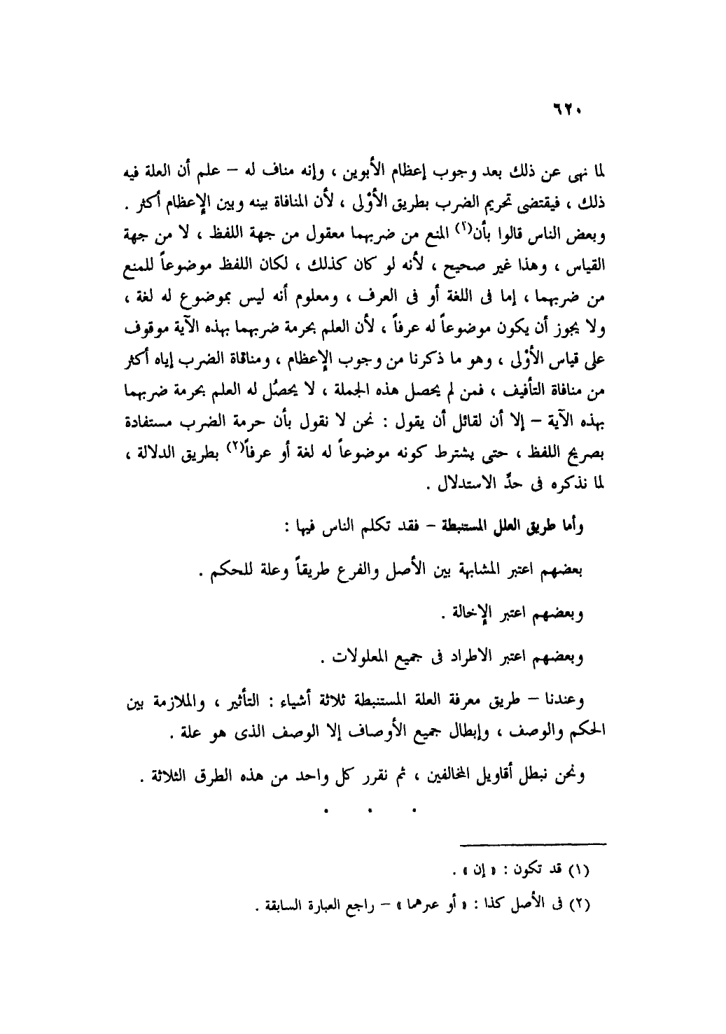 لما نهى عن ذلك بعد وجوب إعظام الأبوين، وإنه مناف له- علم أن العلة فيه ذلك، فيقتضي تحريم الضرب بطريق الأولى، لأن المنافاة بينه وبين الإعظام أكثر. وبعض الناس قالوا بأن المنع من ضربهما معقول من جهة اللفظ، لا من جهة القياس، وهذا غير صحيح، لأنه لو كان كذلك، لكان اللفظ موضوعاً له لغة، ولا يجوز أن يكون موضوعاً له عرفاً، لأن العلم بحرمة ضربهما بهذه الآية موقوف على قياس الأولى، وهو ما ذكرنا من وجوب الإعظام، ومناقاة الضرب إياه أكثر من منافاة التأفيف، فمن لم يحصل هذه الجملة، لا يحصل له العلم بحرمة ضربهما بهذه الآية- إلا أن لقائل أن يقول: نحن لا نقول بأن حرمة الضرب مستفادة بصريح اللفظ، حتى يشترط كونه موضوعاً له لغة أو عرفاً بطريق الدلالة، لما نذكره في حد الاستدلال.