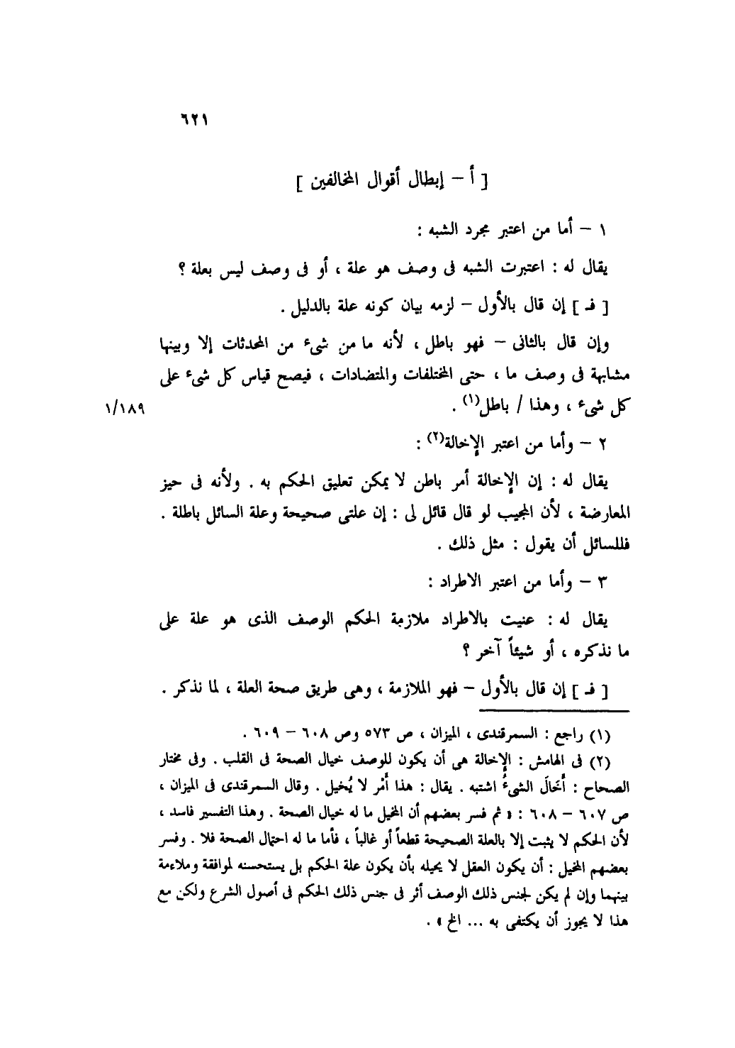 [فـ] إن قال بالأول- فهو الملازمة، وهي طريق صحة العلة، لما نذكر.
