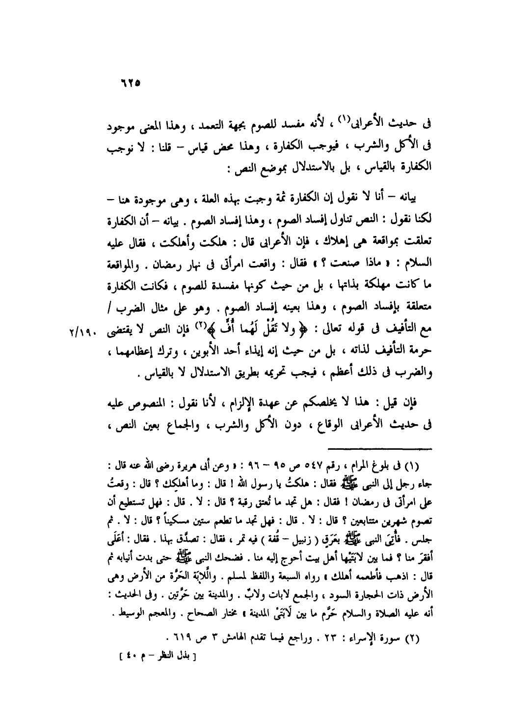 بيانه- أنا لا نقول إن الكفارة ثمة وجبت بهذه العلة، وهي موجودة هنا- لكنا نقول: النص تناول إفساد الصوم، وهذا إفساد الصوم. بيانه- أن الكفارة تعلقت بمواقعه هي إهلاك، فإن الأعرابي قال: هلكت وأهلكت، فقال عليه السلام: "ماذا صنعت؟ " فقال: واقعت امرأتي في نهار رمضان. والمواقعة ما كانت متعلقة بإفساد الصوم، وهذا بعينه إفساد الصوم. وهو على مثال الضرب مع التأفيف في قوله تعالى: {فَلَا تَقُلْ لَهُمَا أُفٍّ} فإن النص لا يقتضي حرمة التأفيف لذاته، بل من حيث أنه إيذاء أحد الأبوين، وترك إعظامهما، والضرب في ذلك أعظم، فيجب تحريمه بطريق الاستدلال لا بالقياس.