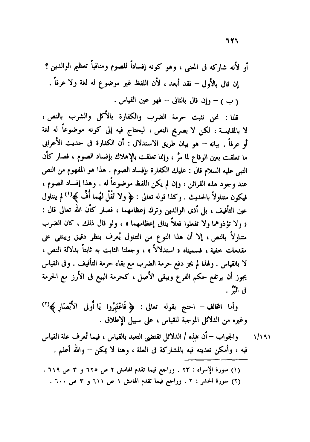 قلما: نحن نثبت حرمة الضرب والكفارة بالأكل والشرب بالنص، لا بالمقايسة، لكن لا بصريح النص، ليحتاج فيه إلى كونه موضوعا له لغة أو عرفاً؟ بيانه- هو بيان طريق الاستدلال: أن الكفارة في حديث الأعرابي ما تعلقت بعين الوقاع لما مر، وإنما تعقلت بالإهلاك بإفساد الصوم، فصار كأن النبي عليه السلام قال: عليك الكفارة بإفساد الصوم. هذا هو المفهوم من النص عند وجود هذه القرائن، وإن لم يكن اللفظ موضوعاً له. وهذا إفساد الصوم، فيكون متناولاً بالحديث. وكذا قوله تعالى: {فَلَا تَقُلْ لَهُمَا أُفٍّ} لم يتناول عين التأفيف، بل أذى الوالدين وترك إعظامهما، فصادر كأن الله تعالى قال: " ولا تؤذوهما ولا تفعلوا فعلاً ينافي إعظامهما"، ولو قال ذلك، كان الضرب متناولاً بالنص، إلا أن هذا النوع من التناول يعرف بنظر دقيق ويبتني على مقدمات خفية، فسميناه " استدلالاً"، وجعلنا الثابت به ثابتاً بدلالة النص، لا بالقياس. ولهذا لم يجز دفع حرمة الضرب مع بقاء حرمة التأفيف. وفي القياس يجوز أن يرتفع حكم الفرع ويبقى الأصل، كحرمة البيع في الأرز مع الحرمة في البر.