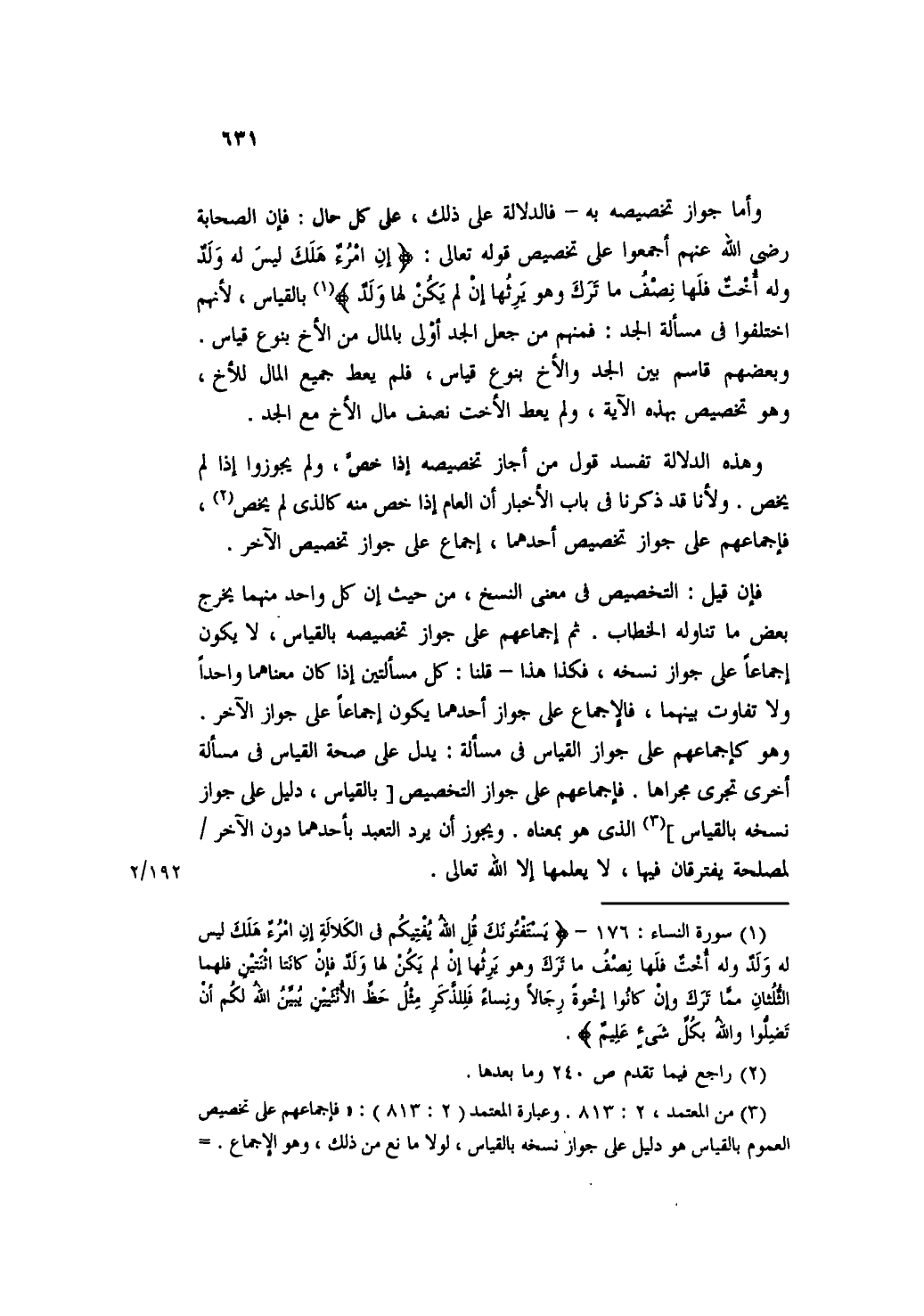 وأما جواز تخصيصه به- فالدلالة على ذلك، على كل حال: فإن الصحابة رضي الله عنهم أجمعوا على تخصيص قوله تعالى: {إِنِ امْرُؤٌ هَلَكَ لَيْسَ لَهُ وَلَدٌ وَلَهُ أُخْتٌ فَلَهَا نِصْفُ مَا تَرَكَ وَهُوَ يَرِثُهَا إِنْ لَمْ يَكُنْ لَهَا وَلَدٌ} بالقياس، لأنهم اختلفوا في مسألة الجد: فمنهم من جعل الجد أولى بالمال من الأخ بنوع قياس. وبعضهم قاسم بين الجد والأخ بنوع قياس، فلم يعط جميع المال للأخ، وهو تخصيص بهذه الآية، ولم يعط الأخت نصف مال الأخ مع الجد.