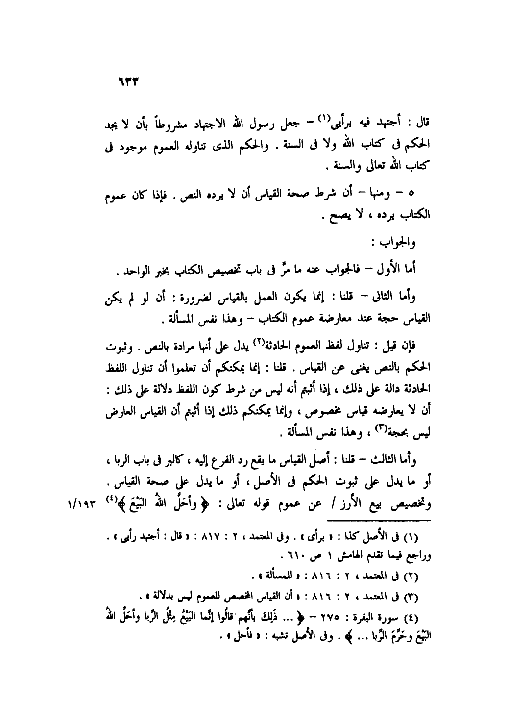 قال: أجتهد فيه برأيي- جعل رسول الله الاجتهاد مشروطاً بأن لا يجد الحكم في كتاب الله ولا في السنة. والحكم الذي تناوله العموم موجود في كتاب الله تعالى والسنة.