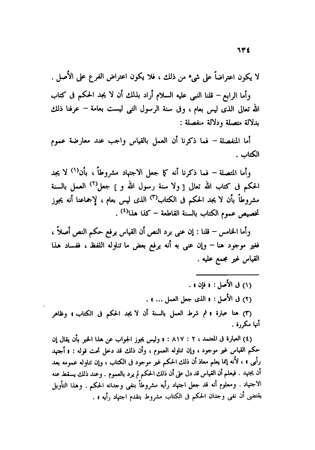 وأما الرابع- قلنا النبي عليه السلام أراد بذلك أن لا يجد الحكم في كتاب الله تعالى الذي ليس بعام، وفي سنة الرسول التي ليست بعامة- عرفنا ذلك بدلالة متصلة ودلالة منفصلة: