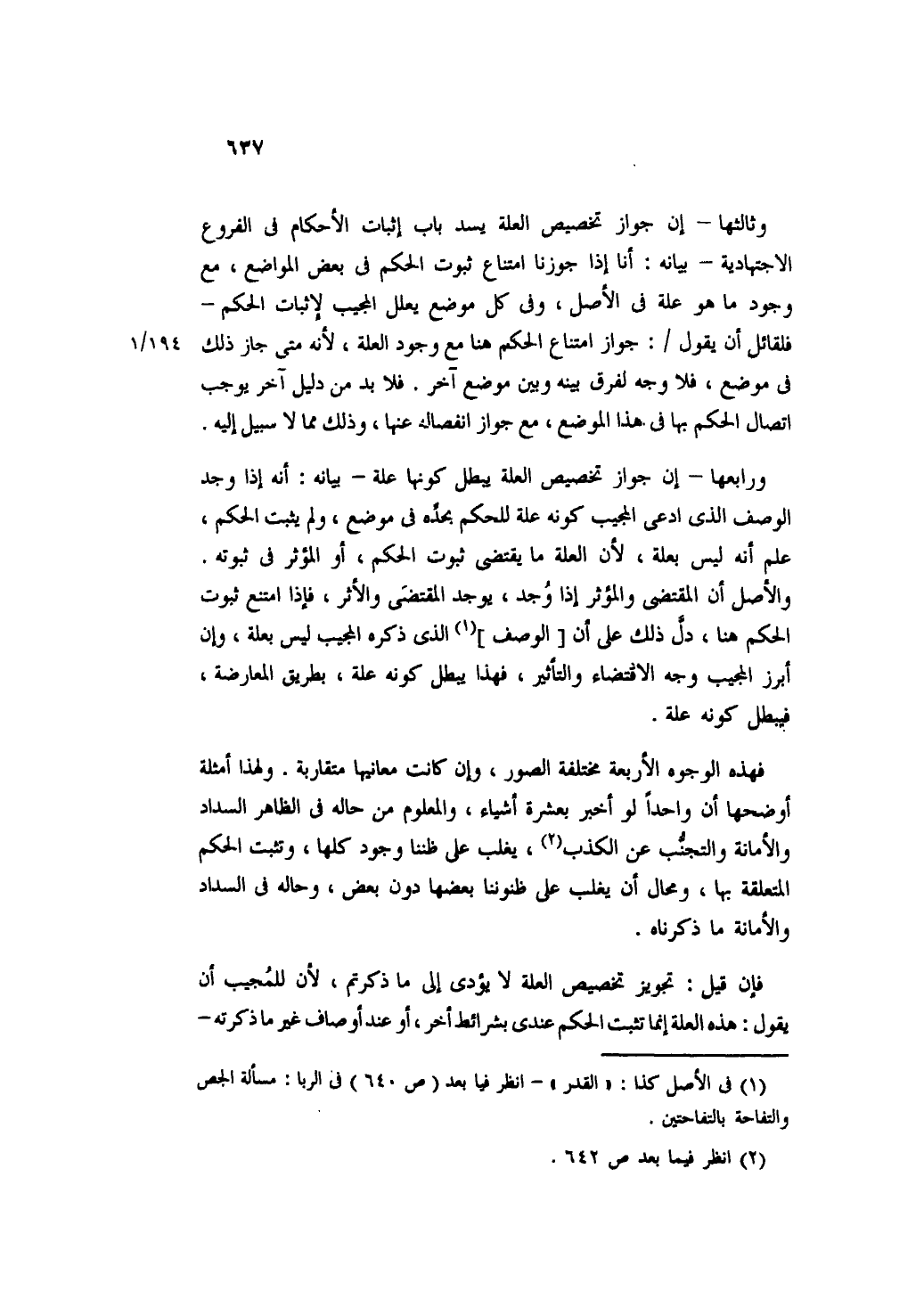 وثالثها- إن جواز تخصيص العلة يسد باب إثبات الأحكام في الفروع الاجتهادية- بيانه: أنا إذا جوزنا امتناع ثبوت الحكم في بعض المواضع، مع وجود ما هو علة في الأصل، وفي كل موضع يعلل المجيب لإثبات الحكم- فلقائل أن يقول: جواز امتناع الحكم هنا مع وجود العلة، لأنه متى جاز ذلك في موضع، فلا وجه لفرق بينه وبين موضع آخر. فلابد من دليل آخر يوجب اتصال الحكم بها في هذا الموضع، مع جواز انفصاله عنها، وذلك مما لا سبيل إليه.