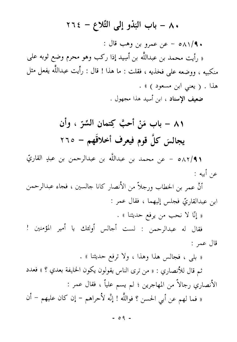 90/582- (ضعيف) عن مُحَمَّدَ بْنَ عَبْدِ اللَّهِ بْنِ عَبْدِ الرَّحْمَنِ بْنِ عَبْدٍ الْقَارِيِّ، عَنْ أَبِيهِ: أَنَّ عُمَرَ بْنَ الْخَطَّابِ وَرَجُلًا مِنَ الْأَنْصَارِ كَانَا جَالِسَيْنِ، فَجَاءَ عَبْدُ الرَّحْمَنِ بْنُ عبدٍ الْقَارِيِّ، فَجَلَسَ إِلَيْهِمَا. فَقَالَ عُمَرُ: "إِنَّا لَا نُحِبُّ مَنْ يَرْفَعُ حَدِيثَنَا". فَقَالَ لَهُ عَبْدُ الرَّحْمَنِ: لَسْتُ أُجالس أُولَئِكَ يَا أَمِيرَ الْمُؤْمِنِينَ! قَالَ عُمَرُ: "بَلَى، فَجَالِسْ هَذَا وَهَذَا، وَلَا تَرْفَعْ حَدِيثَنَا". ثُمَّ قَالَ لِلْأَنْصَارِيِّ: "مَنْ تَرَى النَّاسَ يَقُولُونَ يَكُونُ الْخَلِيفَةَ بَعْدِي"؟ فَعَدَّدَ الْأَنْصَارِيُّ رِجَالًا مِنَ الْمُهَاجِرِينَ؛ لَمْ يُسَمِّ عَلِيًّا. فَقَالَ عمرُ: "فَمَا لَهُمْ عَنْ أَبِي الْحَسَنِ؟ فَوَاللَّهِ! إِنَّهُ لَأَحْرَاهُمْ- إِنْ كان عليهم- أن