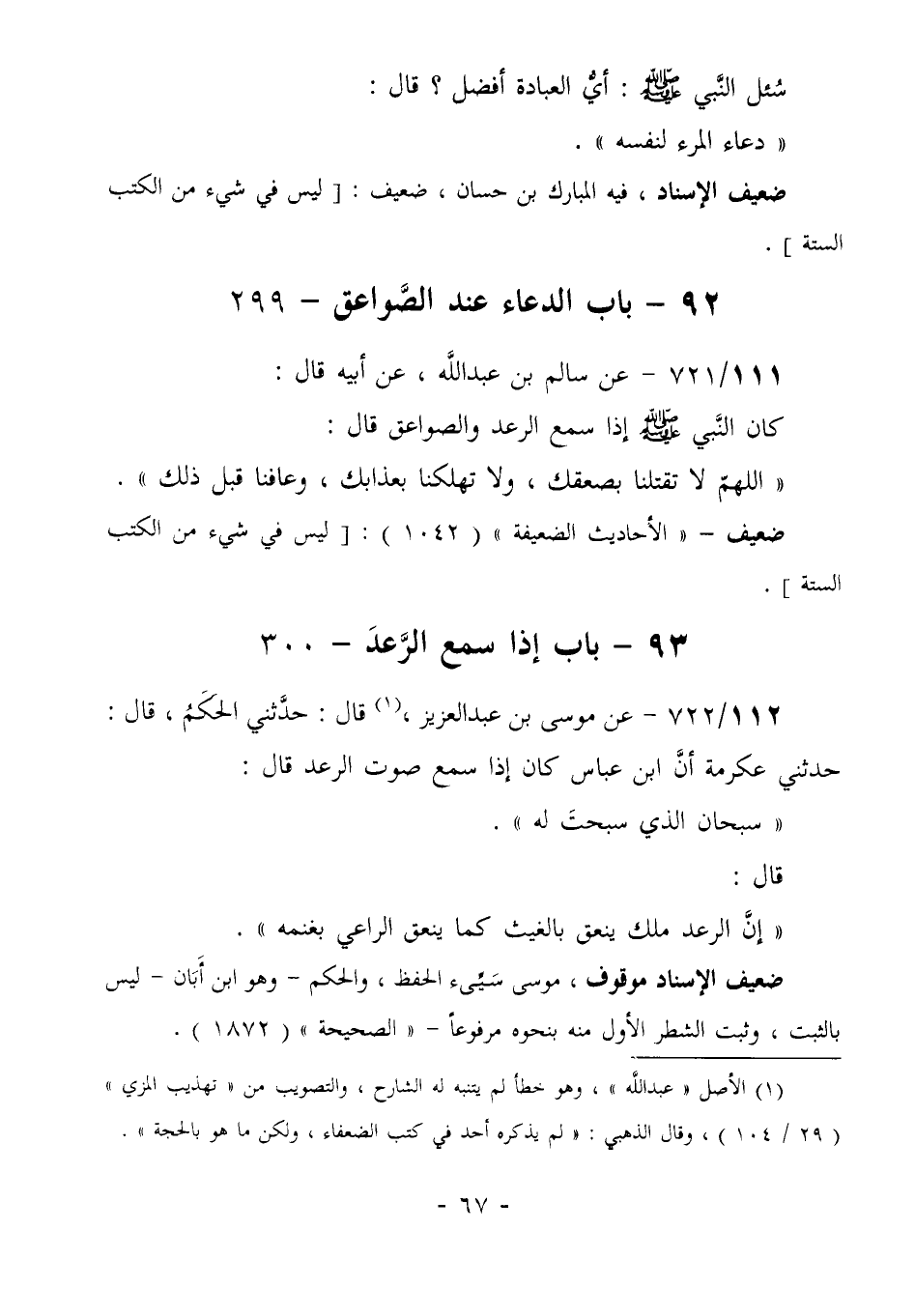 110/721- (ضعيف) عَنْ سَالِمِ بْنِ عَبْدِ اللَّهِ، عَنْ أَبِيهِ قَالَ: كَانَ النَّبِيُّ صَلَّى اللهُ عَلَيْهِ وَسَلَّمَ إِذَا سَمِعَ الرَّعْدَ وَالصَّوَاعِقَ، قَالَ: - "اللَّهُمَّ لَا تَقْتُلْنَا بصعقِكَ، وَلَا تُهلكنا بعذابك، وعافنا قبل ذلك".
